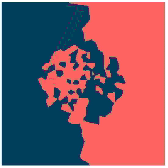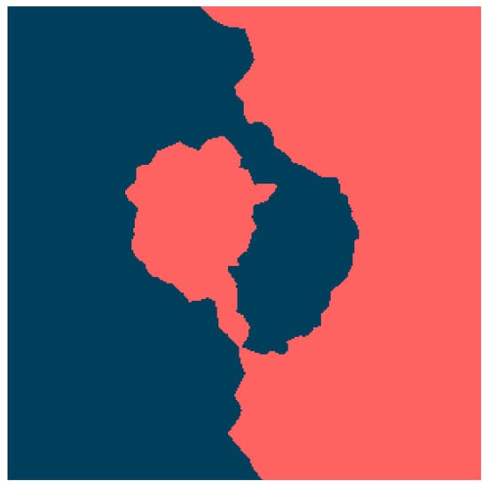 The objective is to reconstruct the original decision surface from this finite sample using the Lipschitz extension frameworks. We compare the performance of the McShane–Whitney mean extension () and the Oberman–Milman extension () under two distinct regimes: the direct extension of binary labels (Section 3.1) and the extension of smoothed probabilities (Section 3.2).