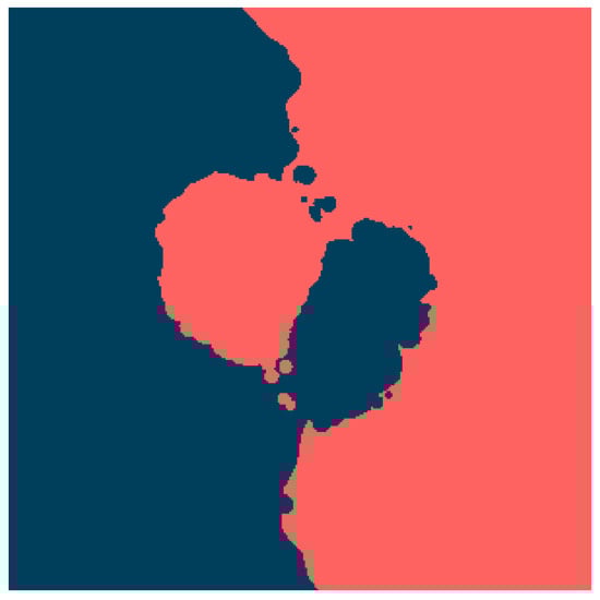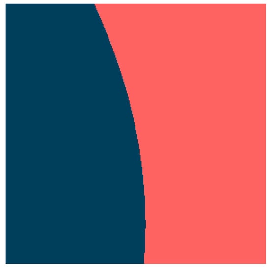 To empirically validate the theoretical properties discussed in the previous sections, we evaluate the proposed classification methods on a synthetic benchmark dataset with non-trivial geometry. Figure 1 illustrates the ground truth surface, which is partitioned into two distinct classes (blue and red). From this domain, we generated a dataset of 300 observations, shown in Figure 2. This synthetic example was specifically designed to present significant challenges for standard classifiers, including a non-linear decision boundary, a narrow separation between classes and the presence of noise (outliers).