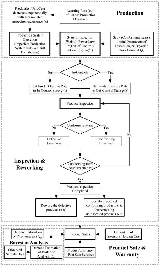 Moreover, Figure 1 illustrates the integrated framework for managing an imperfect production system, incorporating quality inspection, rework processes, and post-sale warranty services. The workflow is organized into three interconnected modules: (1) Production Module (Top): This module depicts the production phase, where unit costs decrease exponentially with accumulated inspection experience (κ), influenced by the learning factor (). The production system follows a Weibull distribution, and system inspection employs a Weibull Power Law model to determine whether the system is in-control or out-of-control states. Key parameters such as conforming items (κ), inspection settings, and Bayesian prior demand estimation () are initialized here. (2) Inspection & Rework Module (Center): This module illustrates the quality control process, where products are inspected and sorted into conforming inventory (non-defective) or defective inventory. Defective items () undergo rework, while conforming products () and remaining uninspected items () are consolidated for further processing. (3) Product Sale & Warranty Module (Bottom): This module depicts the sales phase, incorporating Bayesian posterior demand estimation () to optimize inventory and sales strategies. The process concludes with product warranty provisioning (post-sale service) and estimation of inventory holding costs, thereby closing the loop between production output and customer-facing services.