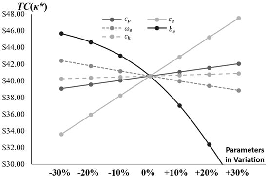 Figure 4 illustrates the sensitivity of the optimal total cost, TC(κ*), to variations in five key production-related parameters: basic manufacturing cost (), first-unit manufacturing cost under the learning curve (), learning factor (), shrinkage constant in the learning curve (), and unit inventory holding cost (). Each parameter is perturbed from −30% to +30% relative to its base value. The analysis reveals distinct impacts: increases in lead to substantial reductions in TC*, as a higher shrinkage constant enhances the learning effect, accelerating cost efficiencies in production and offsetting other expenses. Conversely, increases in result in pronounced rises in TC*, reflecting the amplified baseline for learning-adjusted manufacturing costs that propagate through the system. Parameters such as and show moderate positive sensitivities, with higher values driving up TC* due to elevated direct production and storage costs, while exhibits a negative slope, indicating that stronger learning rates contribute to cost savings but with diminishing marginal returns. Notably, fluctuations in (reworking cost per non-conforming item), though not directly plotted here, interact with these parameters in the broader model; decision-makers should monitor such cost items closely to maintain effective control over total expenses and operational stability.