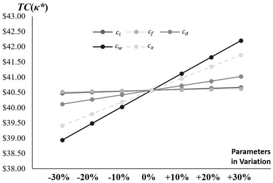 Figure 5 illustrates the sensitivity of TC(κ*) to variations in five inspection and maintenance-related parameters: system inspection cost (), system correction cost (), unit product inspection cost (), unit failure repair cost (), and reworking cost per non-conforming item (), each perturbed from −30% to +30%. The results indicate that increases in and cause the most significant rises in TC*, as these costs directly increase warranty and rework liabilities in deteriorating systems, highlighting their critical role in post-production risk management. Parameters such as , , and exhibit positive but less pronounced sensitivities, with higher values raising TC* through greater upfront quality assurance expenses. Therefore, decision-makers must closely monitor fluctuations in these cost components, especially and , to ensure proactive cost control and alignment with the model’s objective of minimizing overall expenses amid uncertainty.