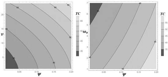 Figure 8 presents two contour plots that examine the impact of defect rates (ψ) in conjunction with product warranty terms (ν) and production learning factors () on the optimal total cost, TC(κ*). The left plot explores the relationship between ψ and ν, revealing a trade-off dynamic. Lower TC values, approximately $35, are concentrated in the lower-left region where ψ is low (e.g., 0.05) and ν is short (e.g., 5). This indicates that maintaining a low defect rate allows for longer warranty periods without significantly increasing costs. As ψ increases, the contours shift upward (e.g., to $50–$65), suggesting that to sustain the same cost level, a higher defect rate requires a reduction in warranty duration. This trade-off presents a strategic challenge for decision-makers, as shortening warranties to offset defect-related costs may reduce product demand and sales volume, potentially eroding profit margins. Therefore, this substitution effect demands careful consideration in operational planning.