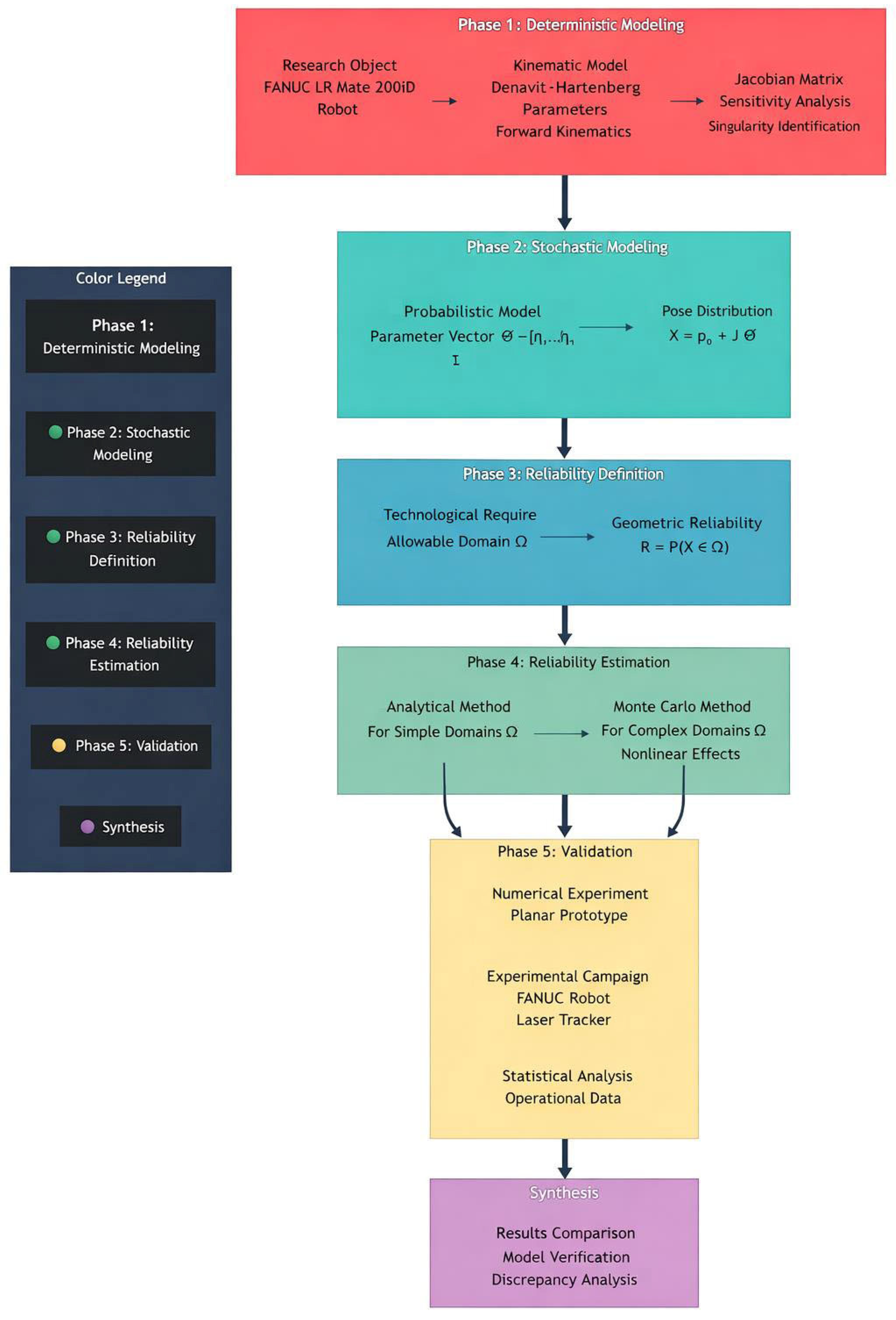 Figure 1 provides a general flowchart of the entire process. The methodology consistently integrates deterministic and probabilistic modeling, reliability evaluation, and experimental validation. The multi-step process begins with the development of an accurate deterministic model of the direct kinematics and Jacobi matrix of the FANUC LR Mate 200iD/7L robot (Phase 1). This model serves as the basis for Phase 2, where key kinematic parameters and control variables are converted into random variables with specified distributions, resulting in a distribution of the end-effector’s posture. In Phase 3, the concept of geometric reliability is formalized by defining the range of permissible values specified by the technological requirements of a particular operation. Phase 4 is the core of the computational process, where two complementary methods are used to estimate the probability of success: analytical (for simple domains) and Monte Carlo numerical simulation (to account for nonlinearities and complex tolerances). Finally, in Phase 5, a comprehensive validation of the entire model is performed through numerical experiments on simplified manipulators, high-precision physical measurements on a real robot, and analysis of long-term operating data. This scheme provides a holistic view of how theoretical constructions are related to practical verification.