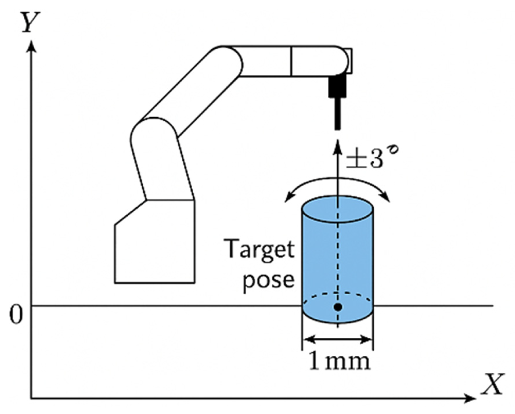 21]. Typical tasks performed by the manipulator—assembly, palletizing, precise positioning, part insertion and feeding, inspection—have well-defined tolerances for position and orientation, making them a natural basis for formalizing reliability in terms of admissible pose ranges. For example, insertion or alignment operations require that the working point is located in a limited cylindrical or ellipsoidal area around the target position, and the orientation is kept within small angular deviations to ensure correct tool entry [