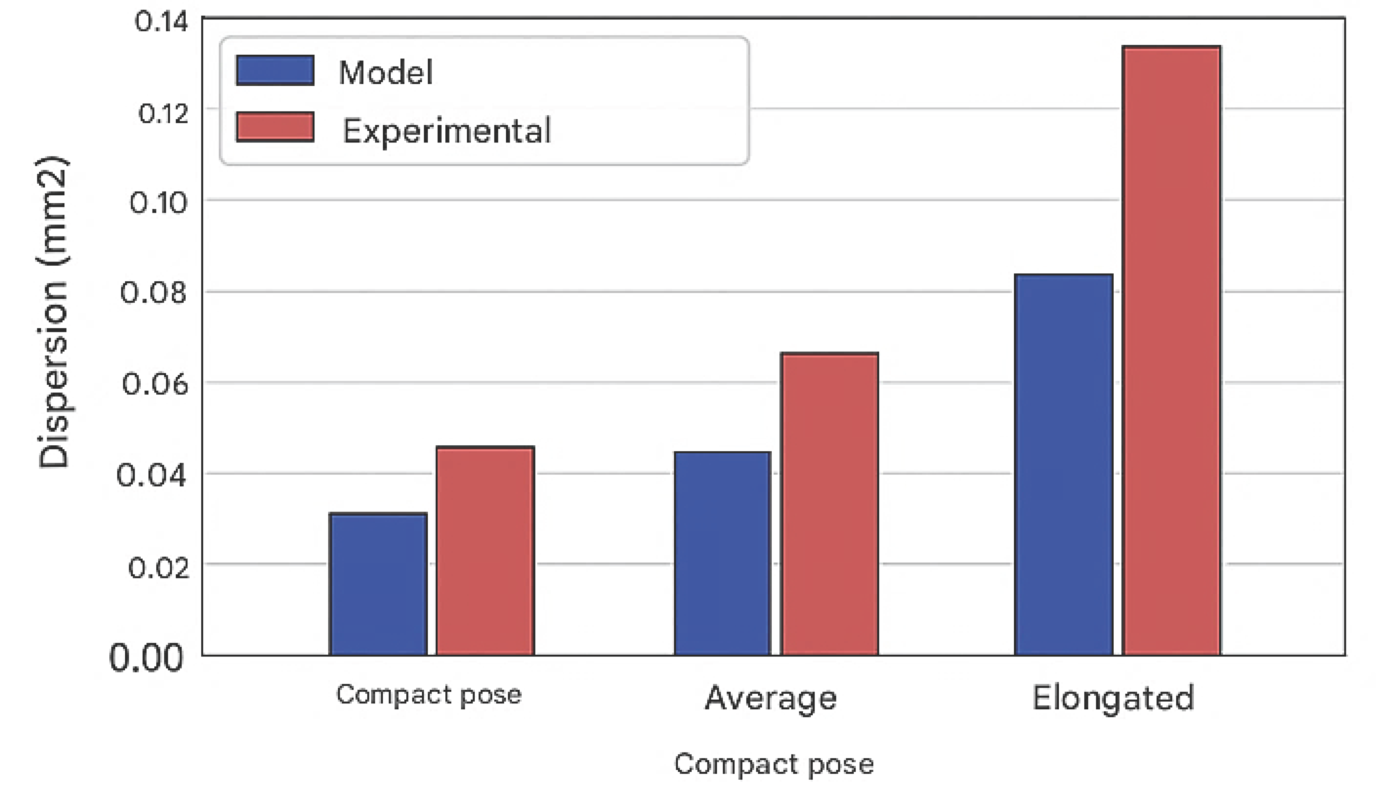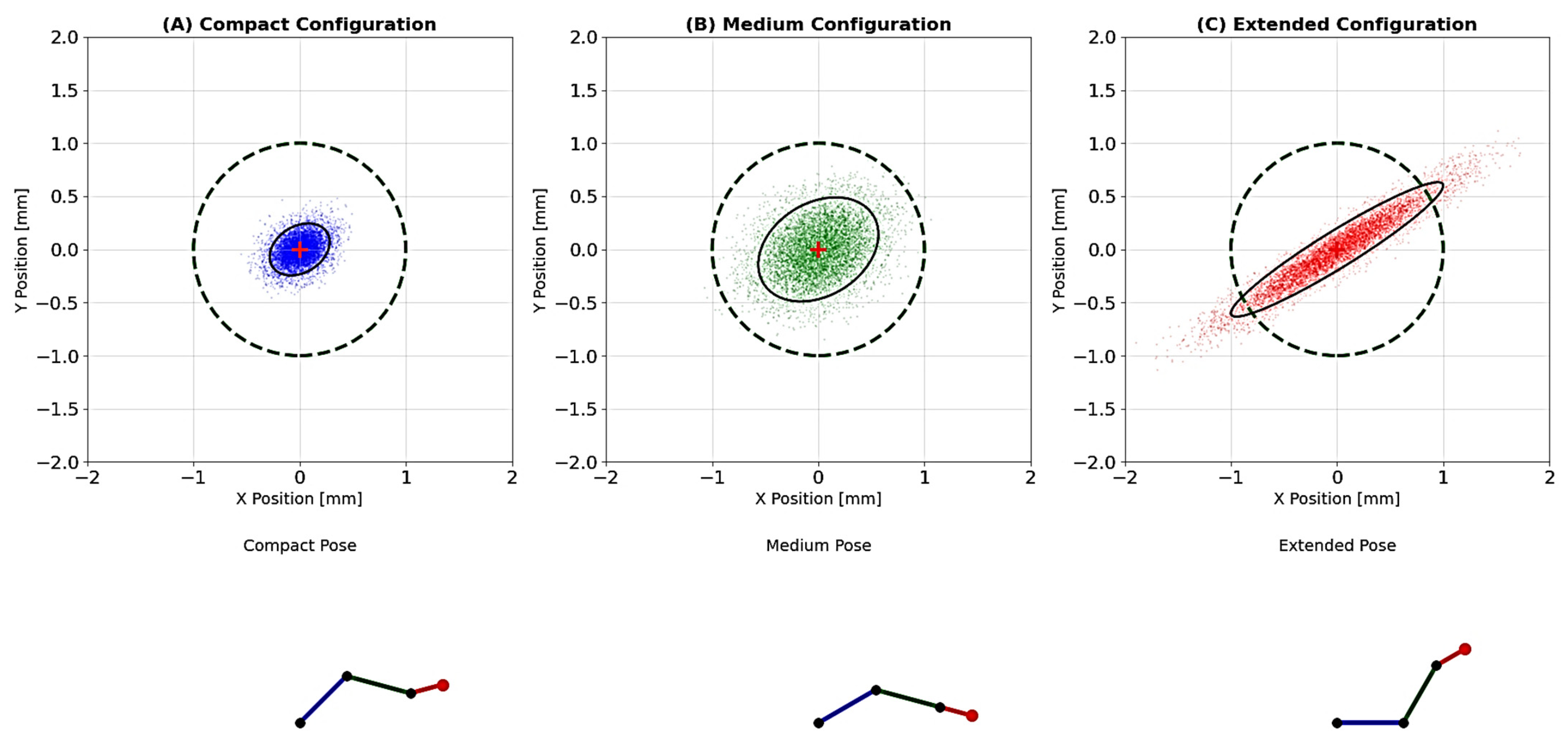 Figure 16 shows a comparison of the experimental and model variance of errors in the three configurations, where it is clearly seen that the compact pose shows a near-perfect match, while the extended configuration deviates more.