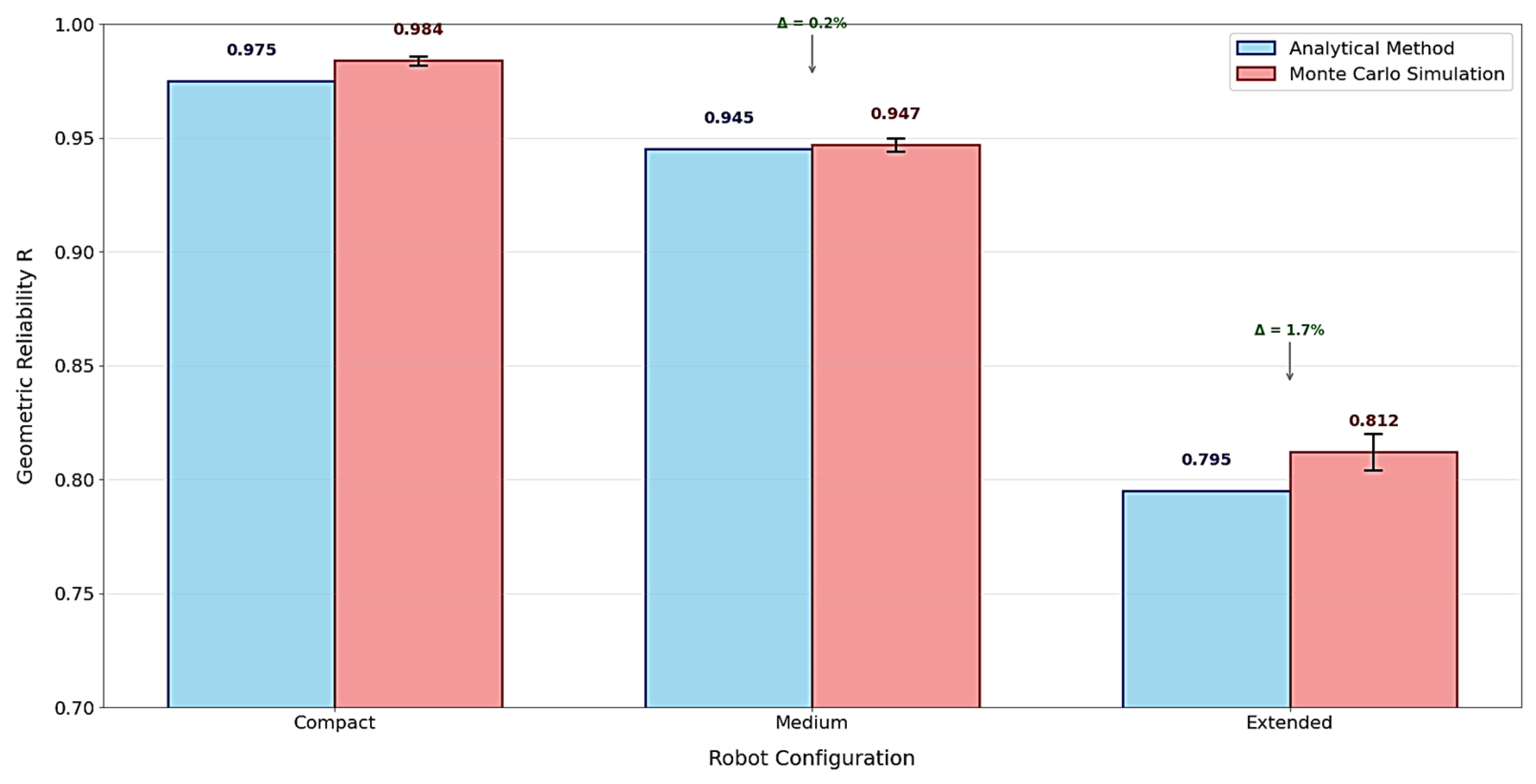 Table 8): Monte Carlo simulations for a typical assembly operation (cylindrical tolerance: radius 1 mm, height 2 mm; orientation ±3°) show reliability decreasing from 0.984 (compact) → 0.947 (medium) → 0.812 (extended), a 17.2% drop attributable to Jacobian sensitivity growth near elbow singularity.