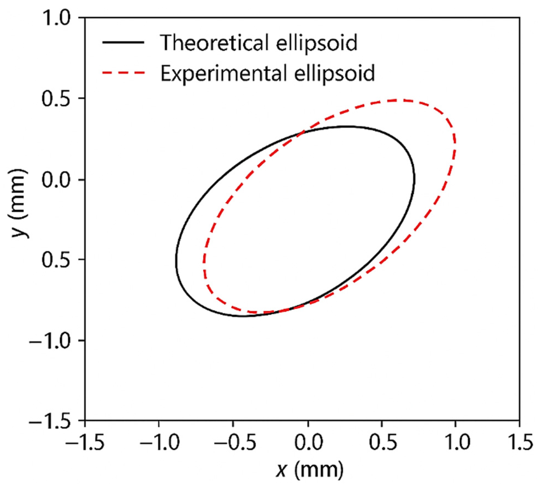 Figure 15. Here you can see that the experimental error ellipsoid is shifted and tilted relative to the model ellipsoid, which indicates the presence of additional factors that are not taken into account in the basic framework.