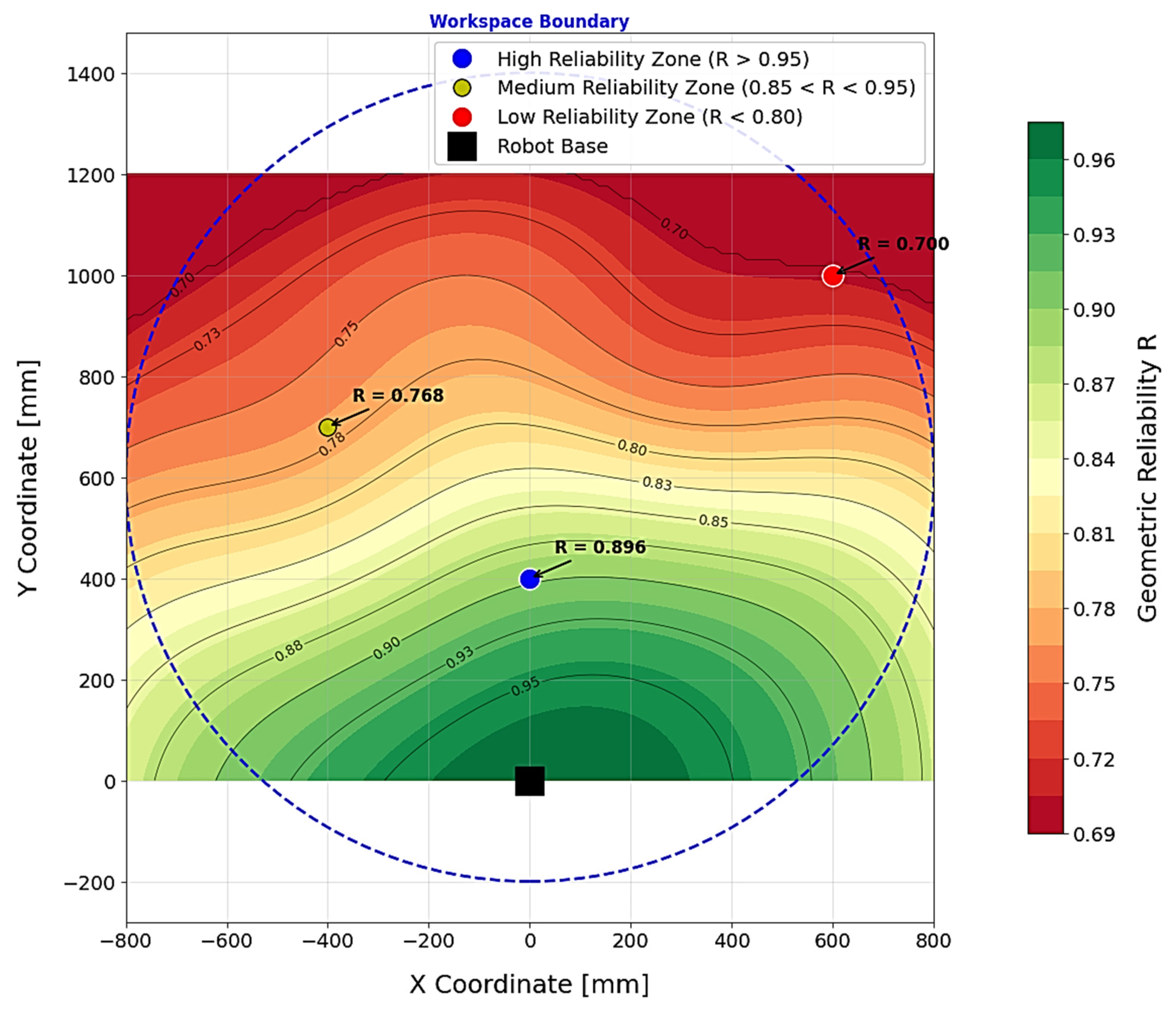 The reliability map demonstrates the spatial heterogeneity of the probability of successful positioning in the robot’s working area. The highest reliability (green areas) is found in the central areas of the workspace corresponding to compact manipulator configurations. As you approach the boundaries of the working area, reliability decreases monotonically, reaching minimum values in peripheral areas (red zones), which is associated with an increase in the coefficients of the Jacobi matrix and an increase in sensitivity to parameter errors. The practical value of this visualization lies in providing a tool for optimal placement of technological objects and planning trajectories that ensure maximum reliability of accurate positioning operations.