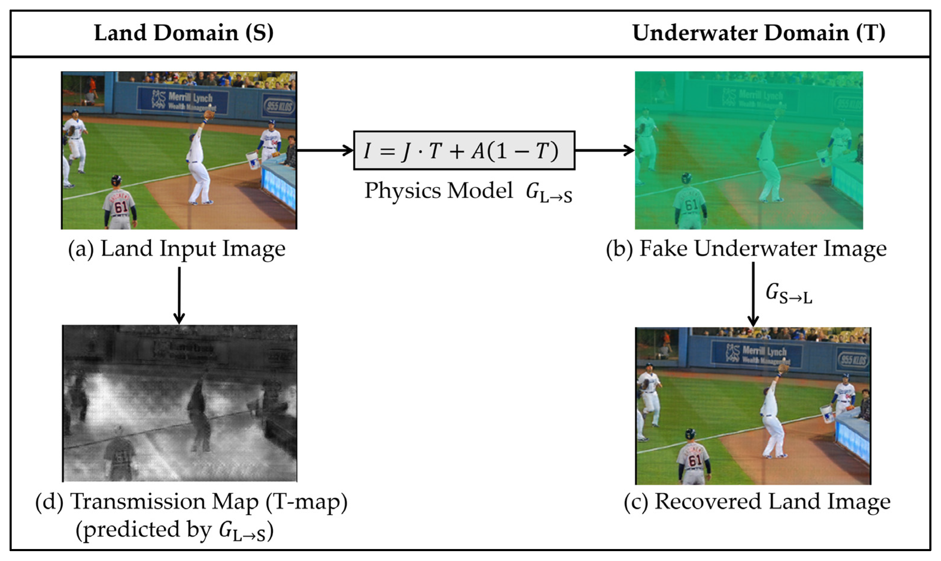This work proposes a different philosophy: rather than treating domain translation as an appearance-only style transfer, we inject physically motivated constraints into the generative model so that the synthesis process respects the dominant phenomena in underwater optics. We present JTA-GAN, a hybrid, non-symmetric GAN framework that explicitly disentangles scene radiance, per-pixel transmission (turbidity) and ambient light, and synthesizes underwater images by applying a differentiable physics layer based on a simplified underwater image formation model: I(x) = J(x) · T(x) + A(x)(1 − T(x)),where J denotes scene radiance (content), T the spatially varying transmission map (turbidity/haze) and A the ambient background illumination (attenuation/color cast). Crucially, the T-map is learned in a self-supervised manner from 2-D image features derived from land images—we do not rely on external depth prediction models or ground-truth depth maps.