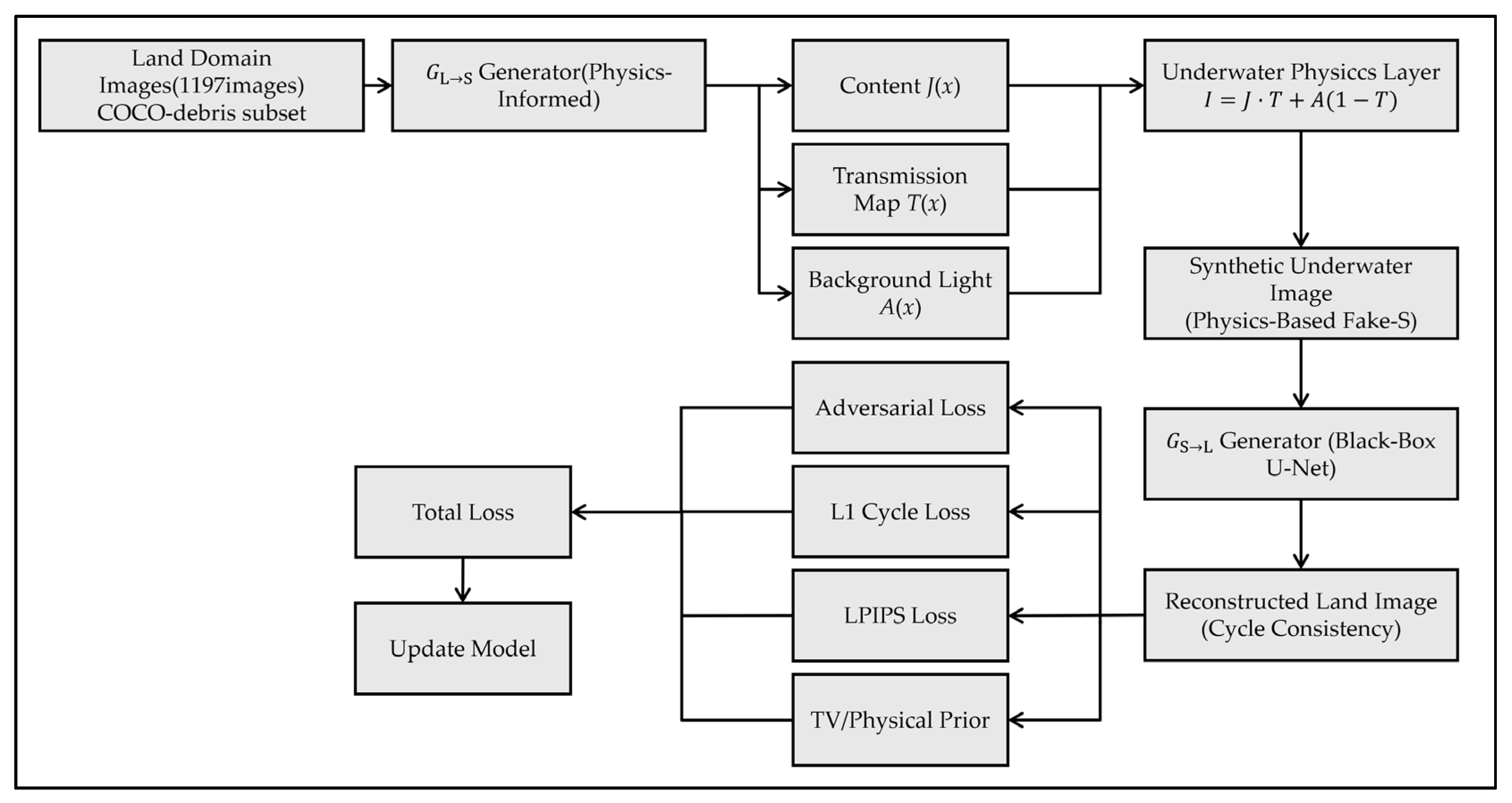 To summarize, existing underwater enhancement models require depth or paired data, standard CycleGAN-type models neglect underwater physics and produce harmful artifacts, and prior synthetic-data works seldom evaluate downstream detection performance. No existing GAN framework explicitly disentangles radiance, turbidity, and ambient light under an underwater formation model. These gaps motivate the development of JTA-GAN, which integrates physics-aware decomposition with stable cycle-consistent training to generate high-fidelity synthetic underwater images for robust object detection.