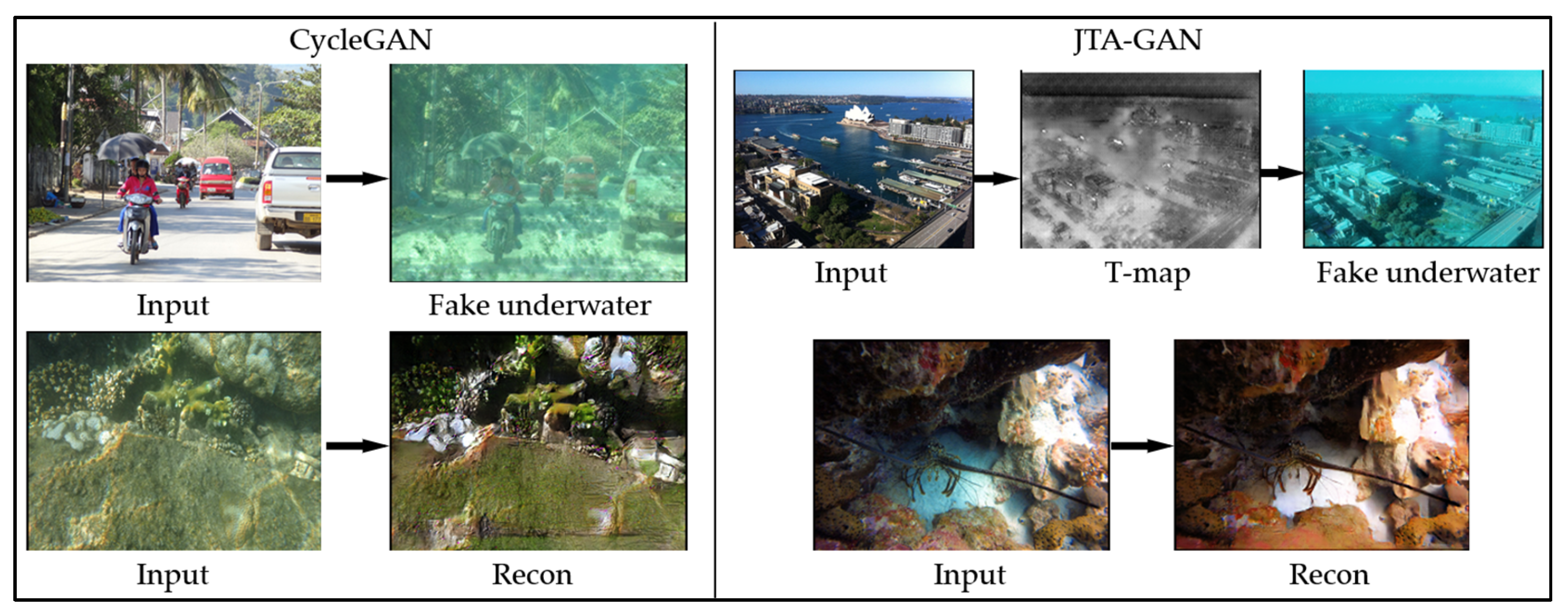 Figure 1. Unlike conventional black-box translation models such as CycleGAN, which rely purely on statistical appearance transformations, JTA-GAN explicitly embeds a simplified underwater optical model into the generative process. This enables the system to disentangle scene radiance from environmental degradations—particularly turbidity and ambient light—thereby producing synthetic underwater images with higher structural fidelity and physical plausibility.
