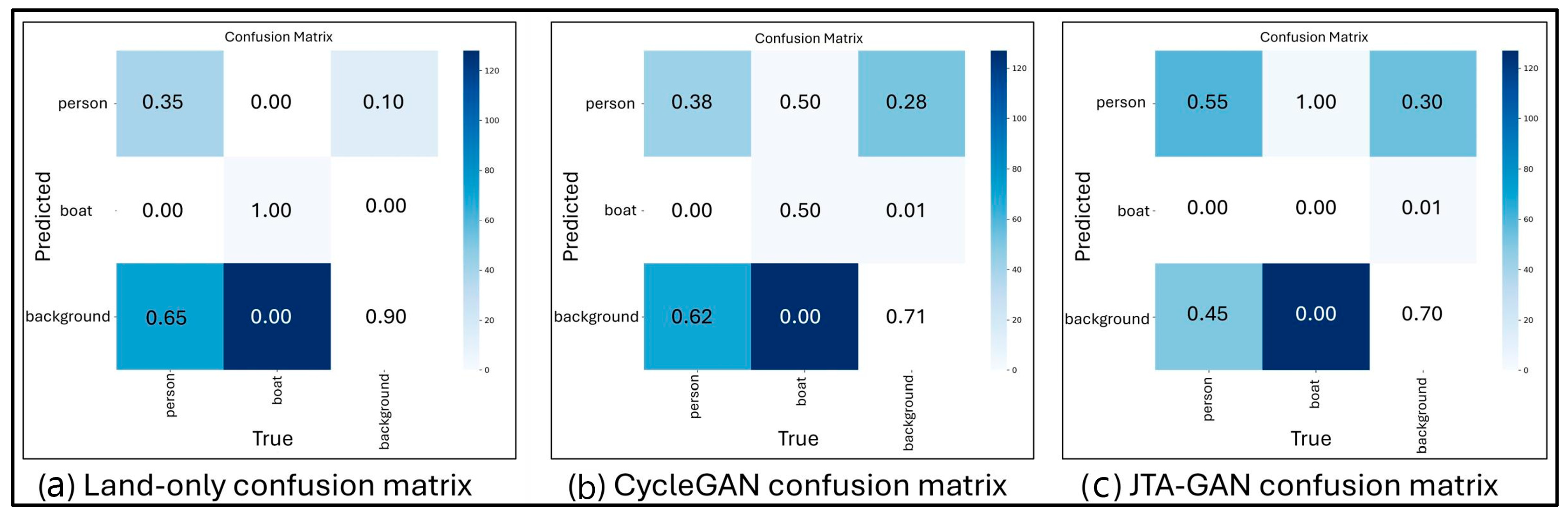 Crucially, despite this mismatch, JTA-GAN does not exacerbate confusion compared with the land-only baseline, demonstrating that the proposed synthesis remains structurally faithful and does not introduce harmful biases.