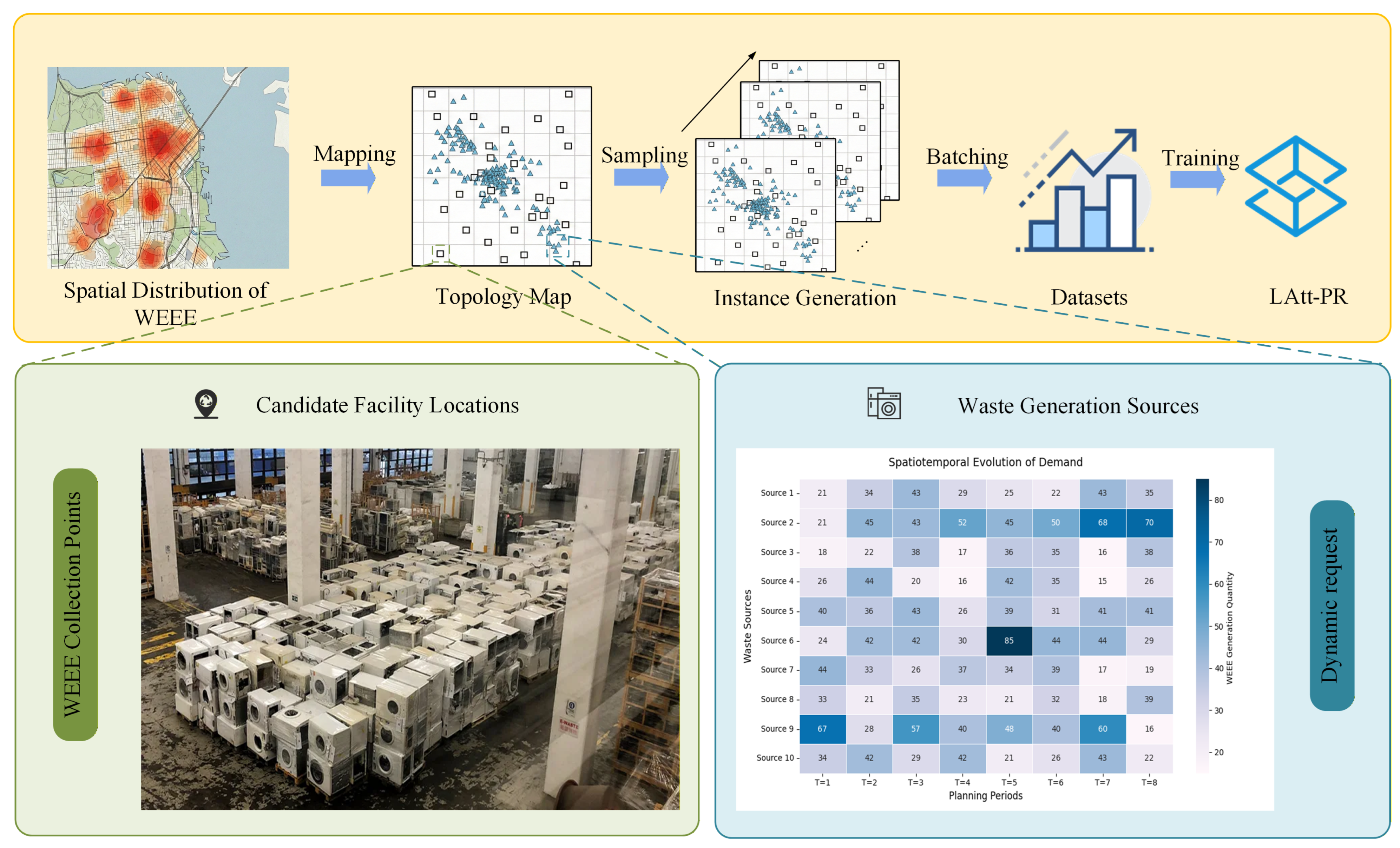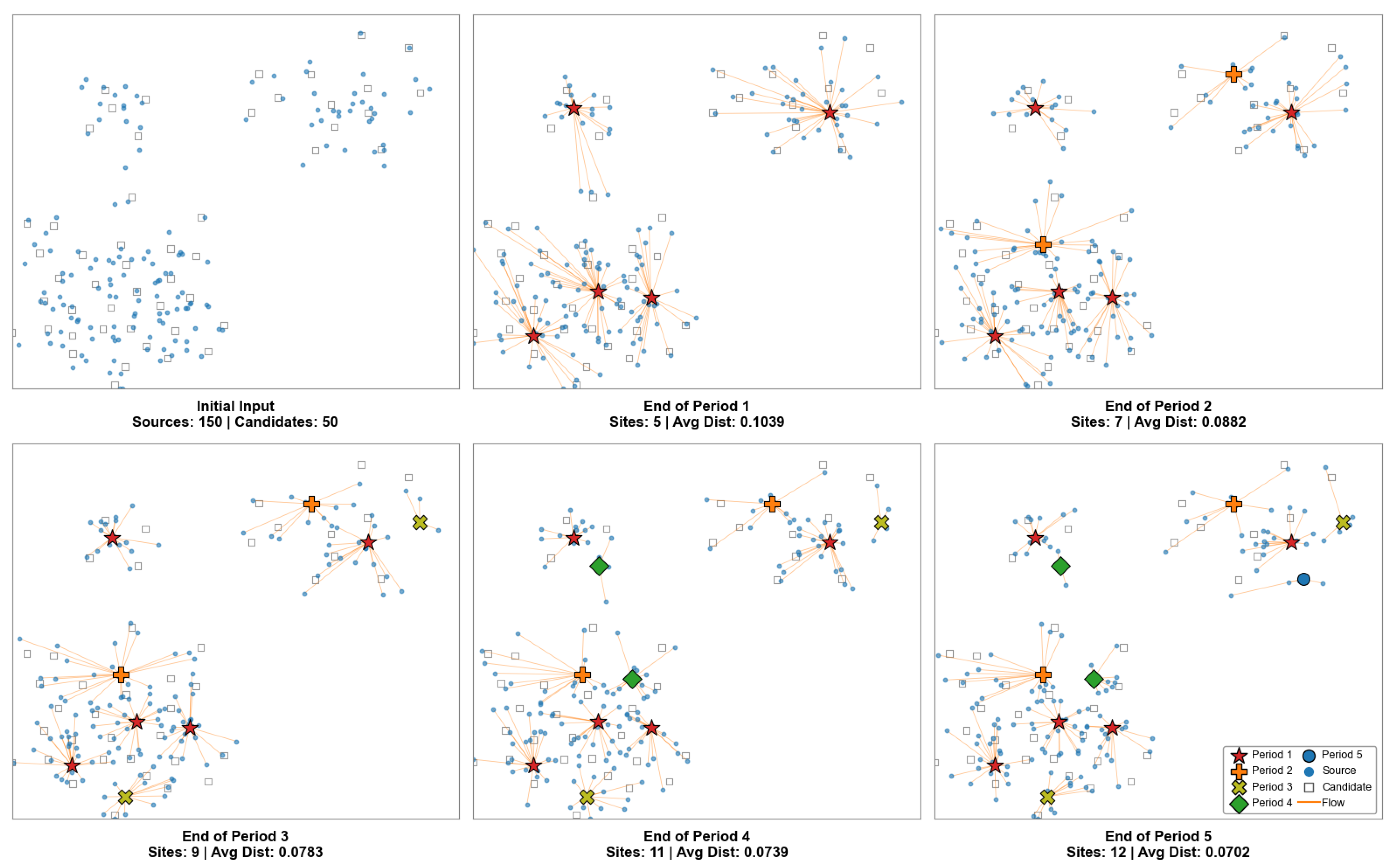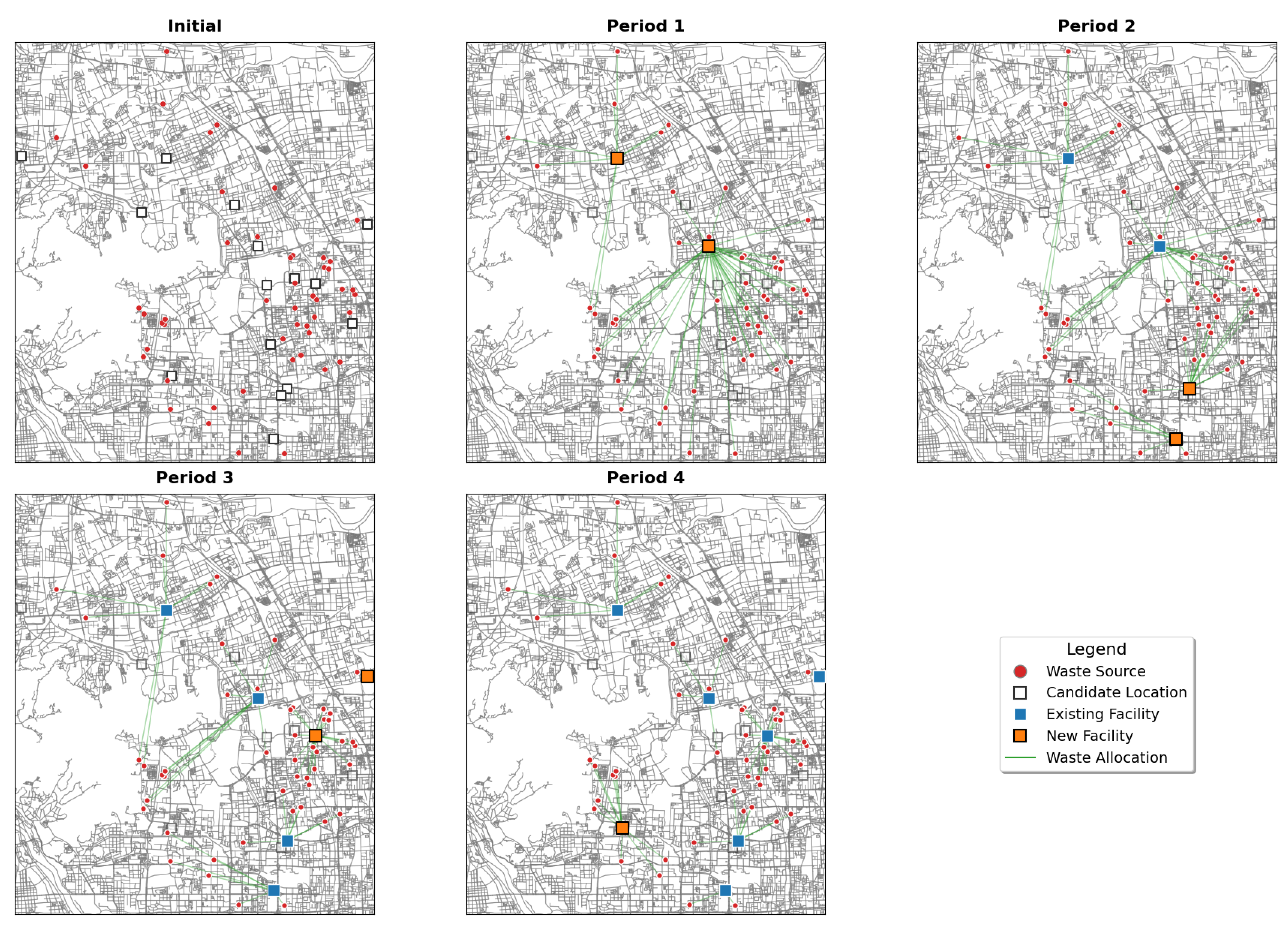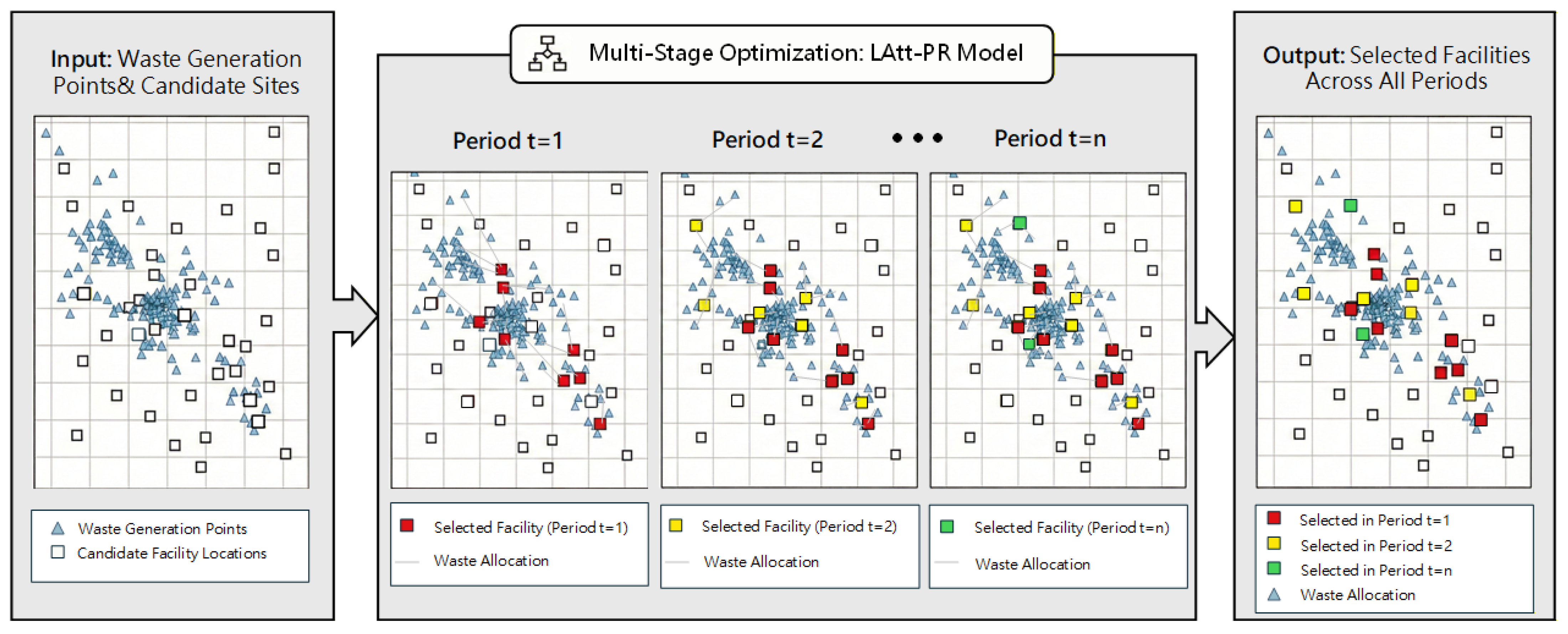 As visualized in the figure, the spatiotemporal evolution of the facility network aligns with the logical expansion of urban demand. In the Initial state, waste sources are densely clustered in the residential core. During Period 1, the model strategically activates two primary facilities in central locations to maximize immediate coverage. As demand grows in subsequent periods, the network dynamically expands outward, activating new facilities in peripheral zones to alleviate capacity bottlenecks. The dense web of allocation lines demonstrates efficient load balancing across the network. This trajectory confirms that LAtt-PR can autonomously generate a hierarchical, cost-effective infrastructure layout that adapts to the complex, irregular topology of real-world metropolitan environments.