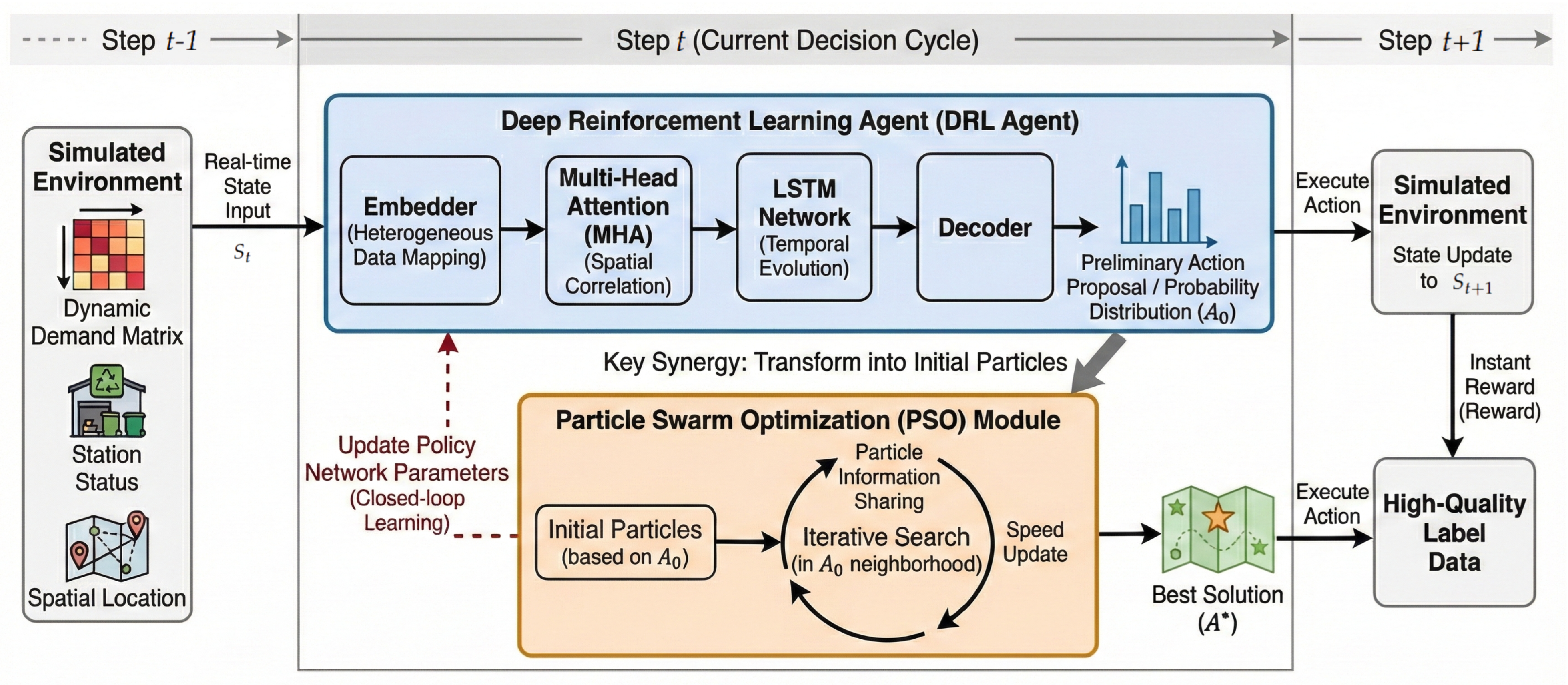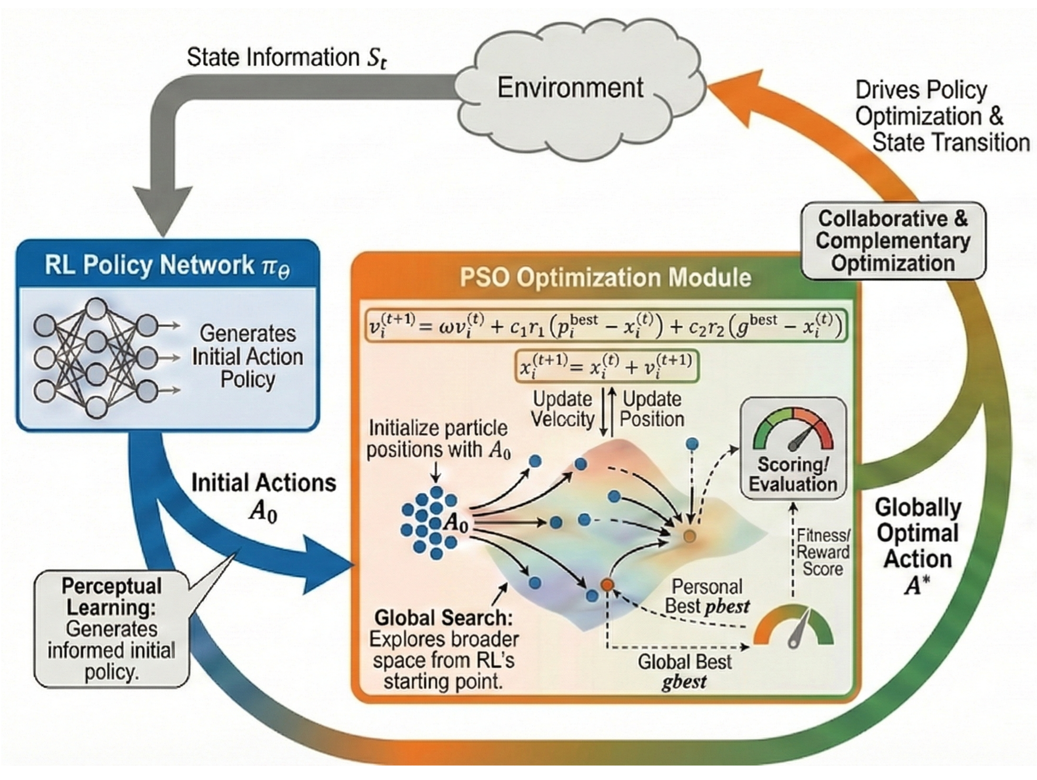 Within the small-scale scenario , the solution space remains relatively compact, which permits pure DRL to approximate the optimal solution; consequently, the marginal utility of PSO refinement is constrained, leading to closely aligned performance curves. Conversely, in the ultra-large-scale scenario , which is characterized by an exponentially expanding solution space, pure DRL frequently fails to identify global extrema, resulting in convergence stagnation at elevated cost levels. In this context, the swarm intelligence search mechanism of PSO becomes decisive. By executing high-density local optimization within the promising neighborhoods identified by DRL, it significantly diminishes the final objective cost. This phenomenon profoundly underscores the necessity of the synergistic coarse-grained guidance and fine-grained polishing framework: DRL facilitates rapid pruning and yields high-quality initial search points, which effectively prevents PSO from becoming trapped in local optima within high-dimensional spaces; in turn, PSO compensates for the inherent precision limitations of DRL during the final refinement stage, ensuring that the architecture maintains a competitive advantage even in large-scale and complex environments.