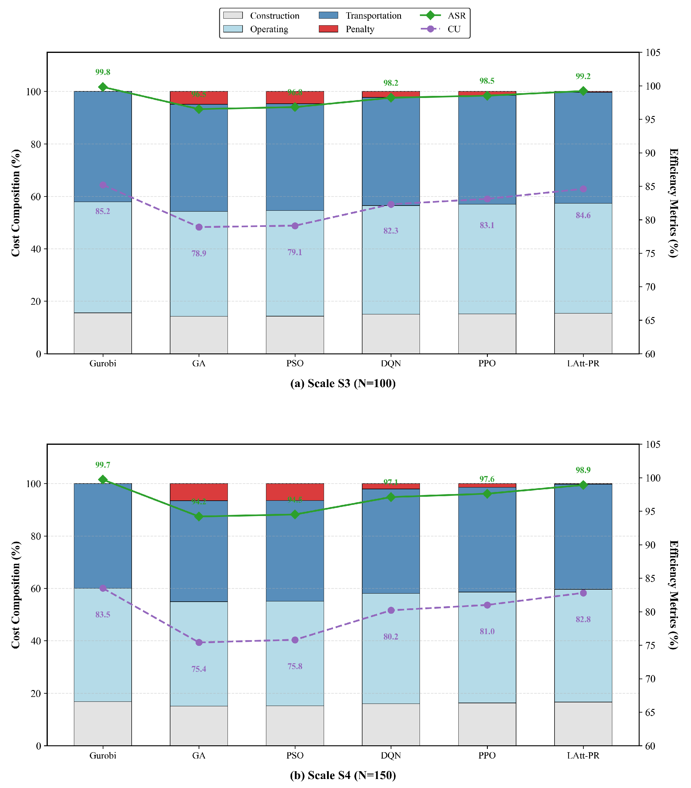 Figure 6, its ASR curve remains consistently near 100%, mirroring the performance of Gurobi, while GA and PSO decline to approximately 94%. This performance disparity is elucidated by the cost composition: GA and PSO incur high penalty costs exceeding 6.5% due to their myopic attempts to minimize initial construction costs at approximately 15.1%, which leads to severe supply shortages. Conversely, LAtt-PR maintains a balanced construction investment of 16.6% to effectively eliminate penalties, reducing them to only 0.3%, thereby achieving an optimal equilibrium between cost-effectiveness and service quality. This contrast indicates that while traditional metaheuristics are prone to becoming trapped in low-construction-cost local optima, LAtt-PR successfully bypasses such short-sighted strategies within high-dimensional discrete solution spaces.