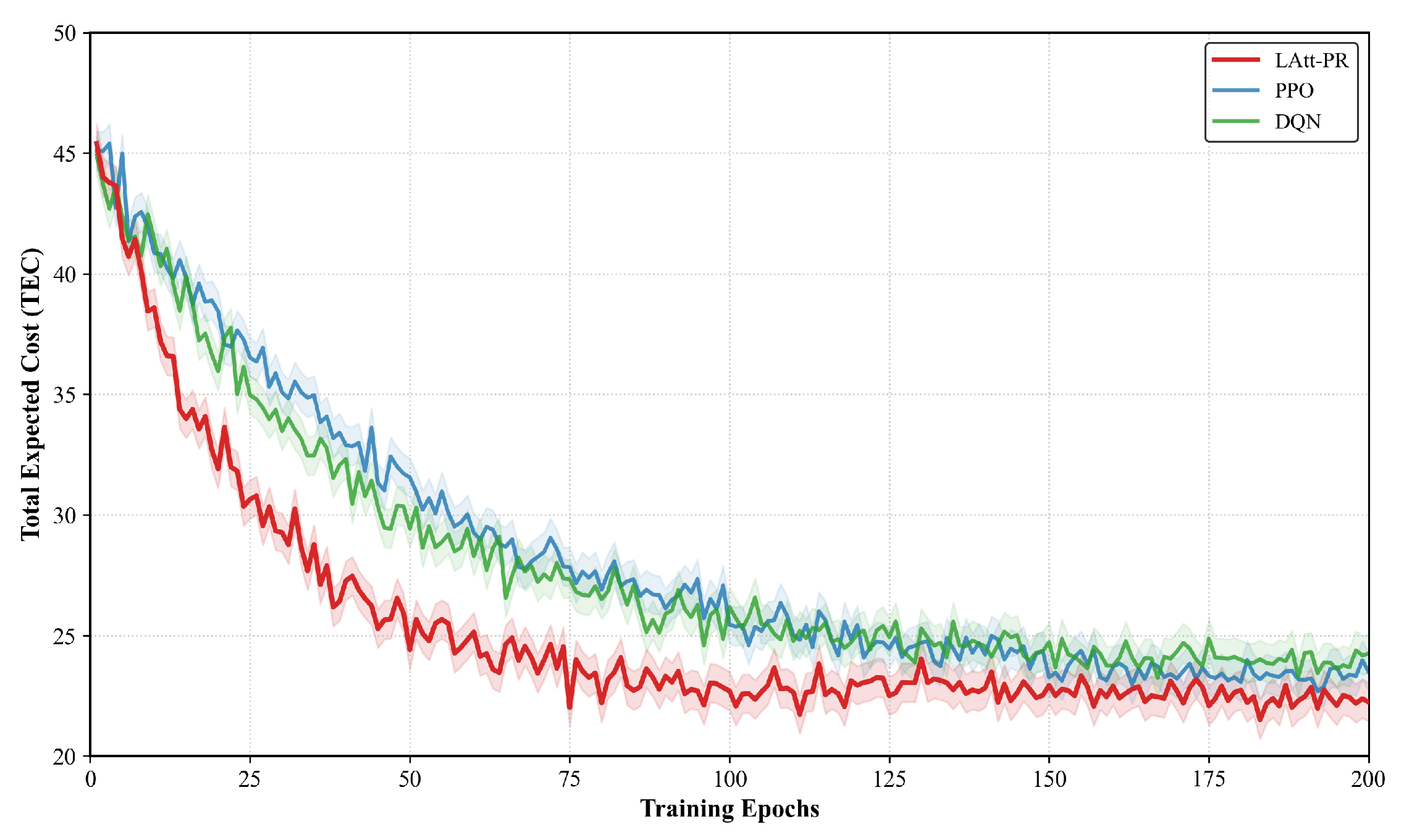 LAtt-PR exhibits significantly superior convergence characteristics throughout the training process: regarding convergence speed, the cost curve of LAtt-PR enters a plateau phase after approximately 50 training epochs, whereas PPO and DQN require roughly 100 and 125 epochs, respectively, to reach a comparable steady state, indicating that the local fine-grained search of PSO provides high-quality, low-variance gradient signals for policy updates, thereby effectively accelerating the exploration process within the policy space; furthermore, in terms of stability, the reward curve of LAtt-PR exhibits significantly smaller fluctuations and follows a smooth downward trend, while the curves for PPO and DQN display multiple pronounced oscillations and performance regressions during the mid-training phase, reflecting the issues of policy degradation and high variance inherent in pure reinforcement learning exploration within high-dimensional discrete action spaces.