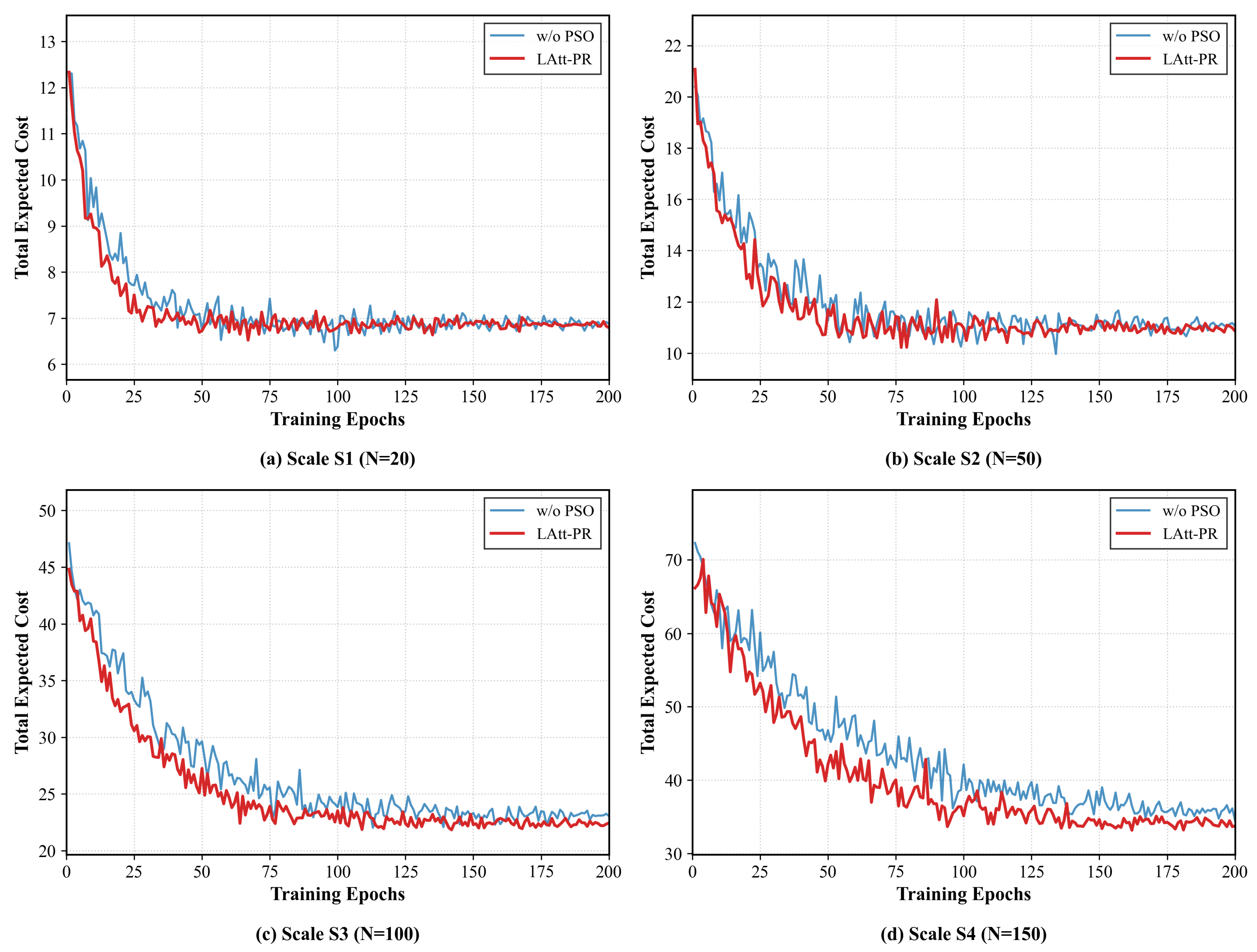. It is clearly observable that the hybrid strategy outperforms the ablation variant in both convergence velocity and solution quality. Specifically, LAtt-PR, represented by the red line, exhibits superior convergence efficiency across all tested scales. Compared to the w/o PSO variant, indicated by the blue line, which relies solely on policy gradients for exploration, the integration of PSO enables the algorithm to achieve a steeper descent during the initial training stages and ultimately reach a lower steady-state cost. More crucially, as the problem scale expands from