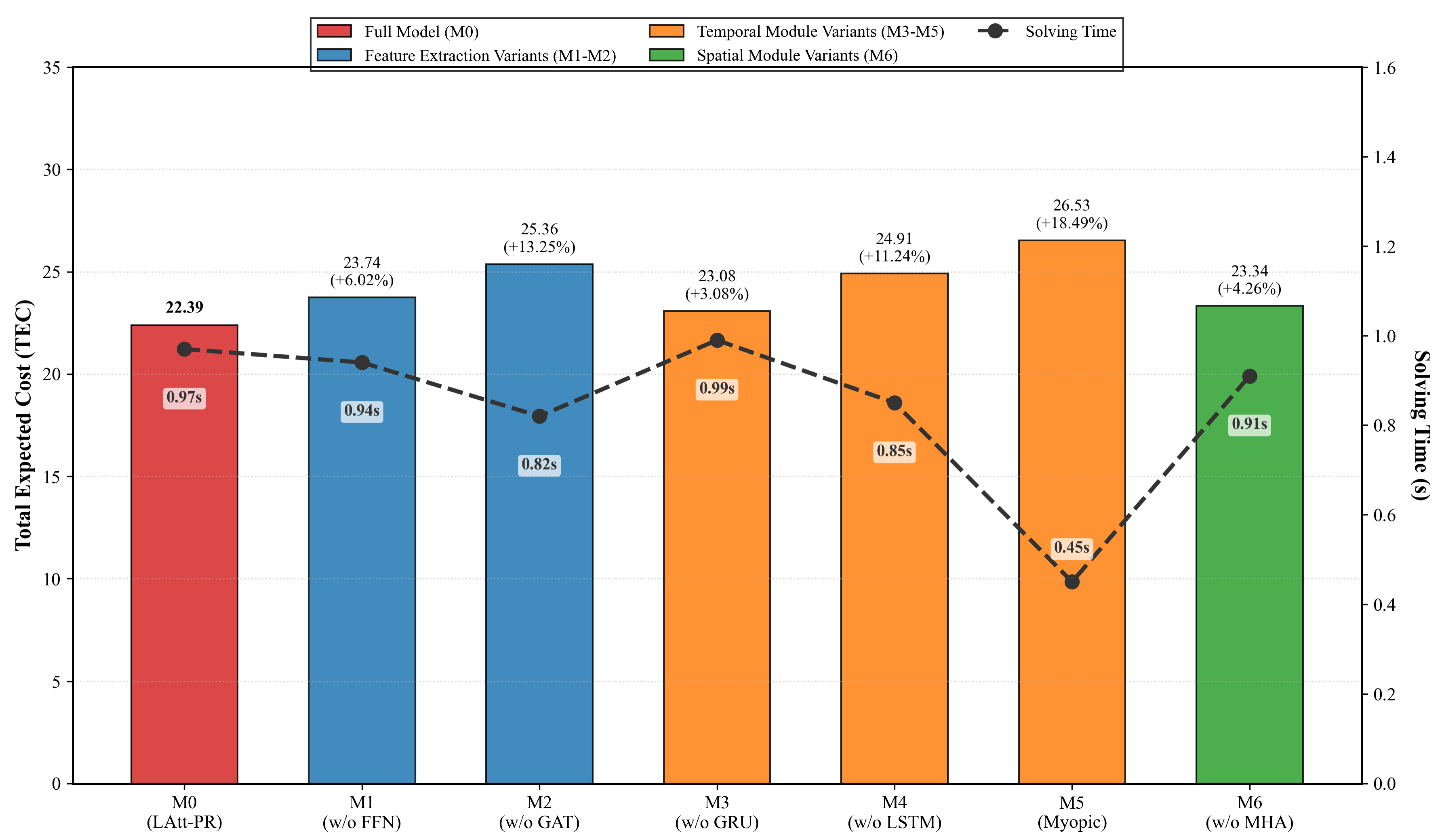 After establishing the overall performance advantages of the LAtt-PR framework, this paper designs two sets of controlled experiments to further dissect the internal sources of its superior performance and verify the necessity of each core module’s design, specifically exploring the contributions of the hybrid optimization strategy and the spatiotemporal neural network components. First, focusing on the synergistic gains of the hybrid search strategy, this study aims to quantify the local refinement contribution of the PSO module within the framework by constructing an ablation variant, LAtt-PR w/o PSO, which eliminates the back-end population search process and directly employs the probability distribution output by the DRL policy network for sampling decisions.