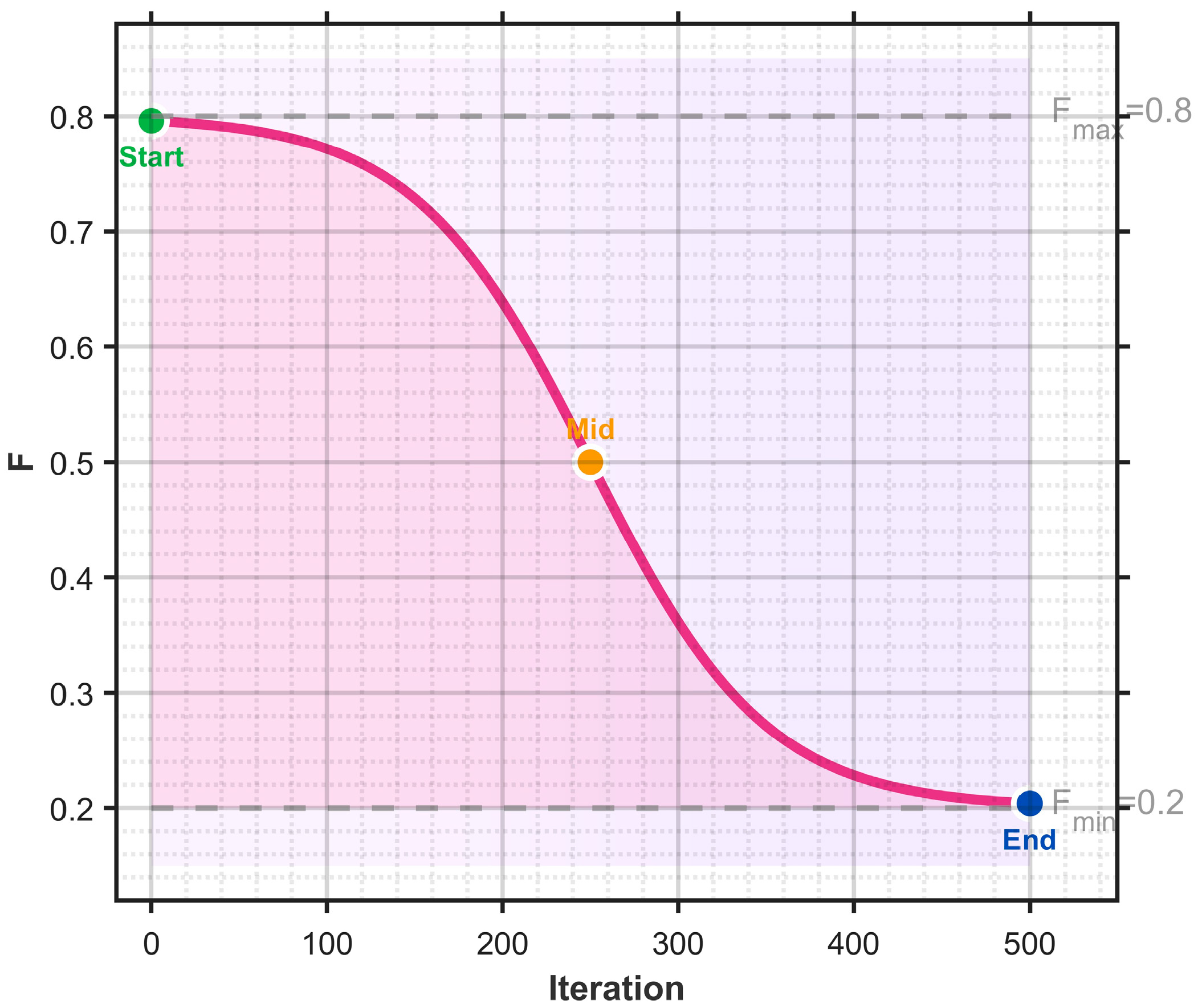 | 1: Initialize population size, bounds , Maximum iteration number and Problem dimension dim. 2: by Equation (1). 3: Evaluate fitness for all individuals and determine initial global best 4: while do 5: Sort population according to fitness values and Select elite individuals . 6: Generate random weight vector , disturbance factor and dynamically adjusted scaling factor . 7: Construct multi-elite guiding vector using Equation (8). 8: for 9: if 10: Update position using exploration strategy (Equation (2)). 11: else if 12: Update position using transition strategy (Equation (3)). 13: else 14: Update position using quadratic interpolation strategy (Equation (4)). 15: end if 16: Apply soft boundary rebound mechanism (Equation (13)). 17: Perform random global or local perturbation (Equation (5)). 18: Embedded differential evolution search strategy (Equations (9)–(12)). 19: Apply soft boundary rebound mechanism (Equation (13)). 20: Apply greedy selection and update population 21: end for 22: Update global best solution . 23: end while 24: Return . |