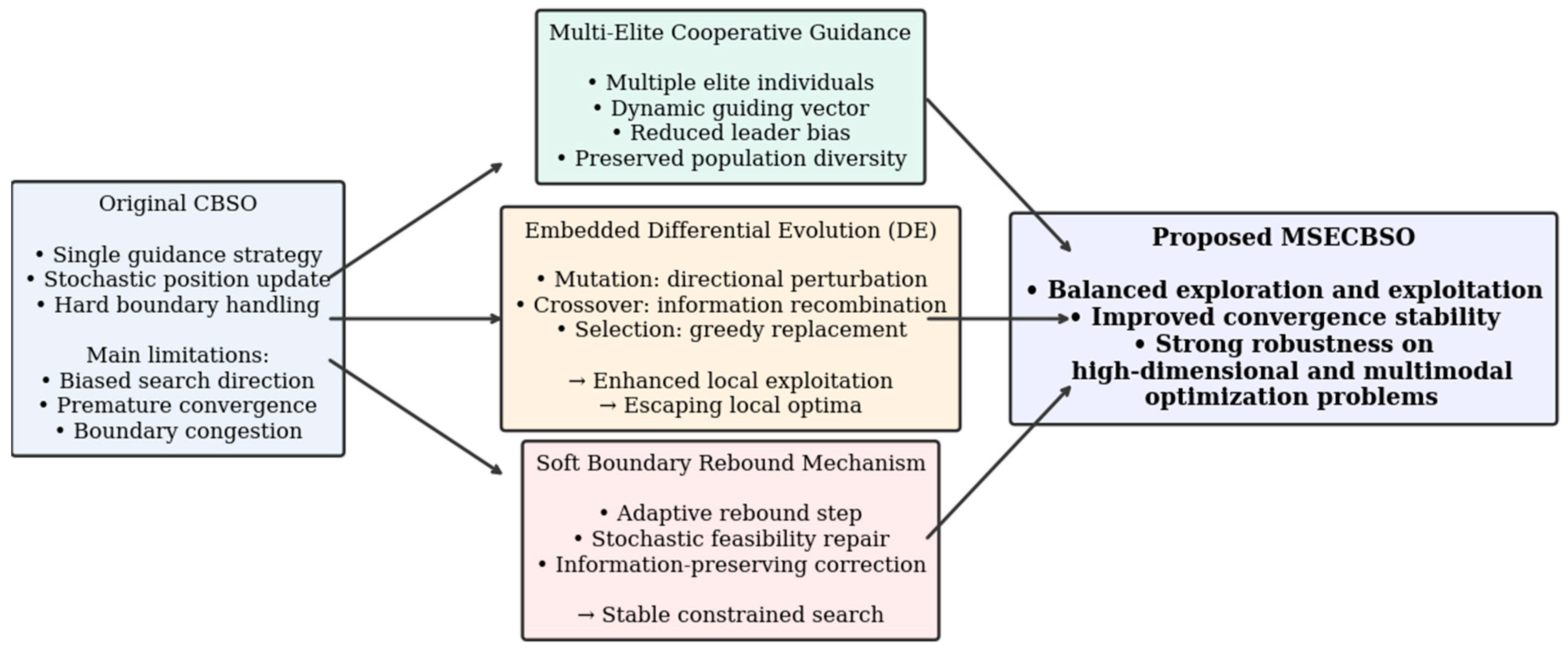 - A multi-strategy optimization framework is developed by integrating multi-elite cooperative guidance, embedded differential evolution search, and a soft boundary rebound mechanism into CBSO, resulting in the proposed MSECBSO algorithm.