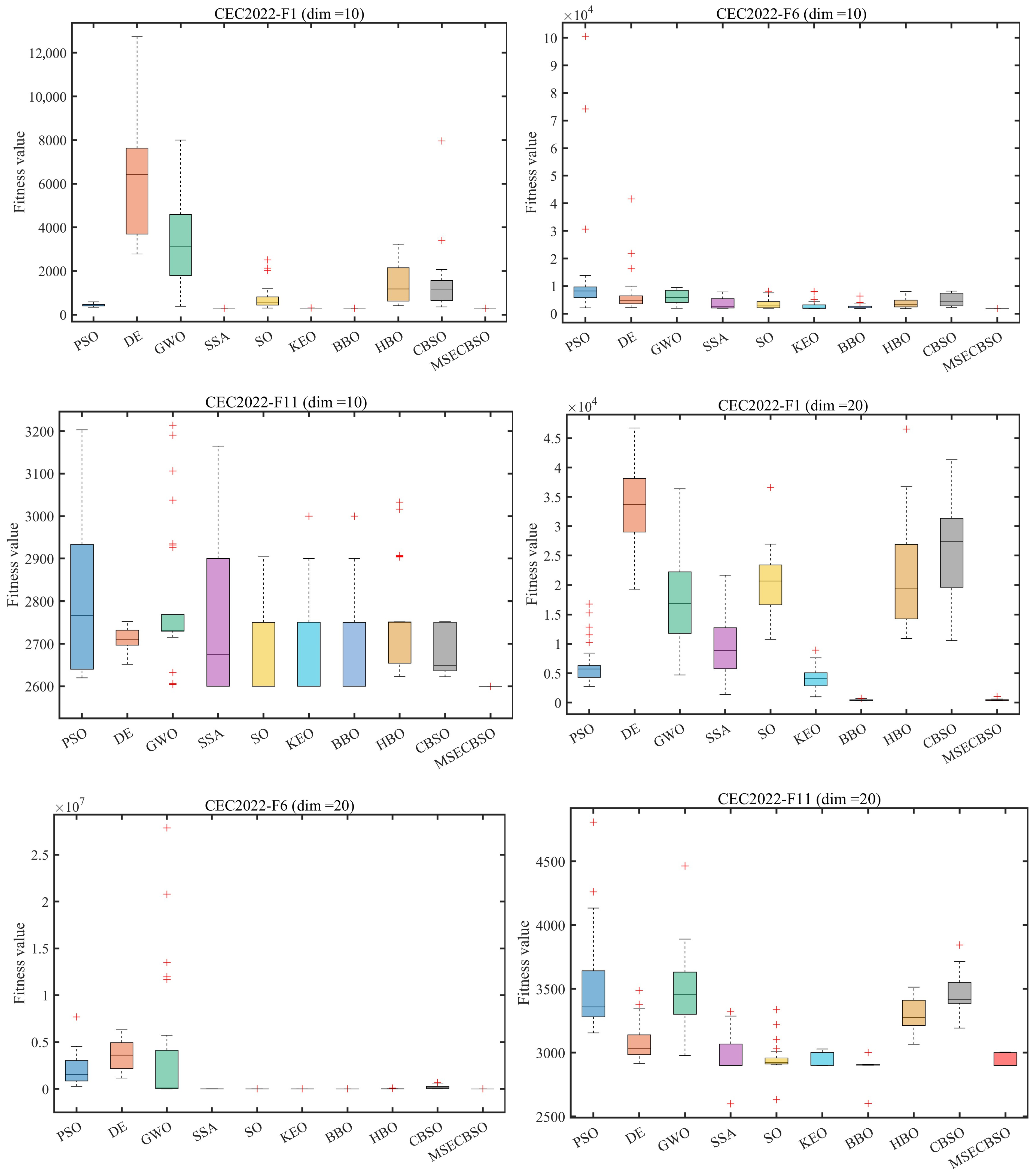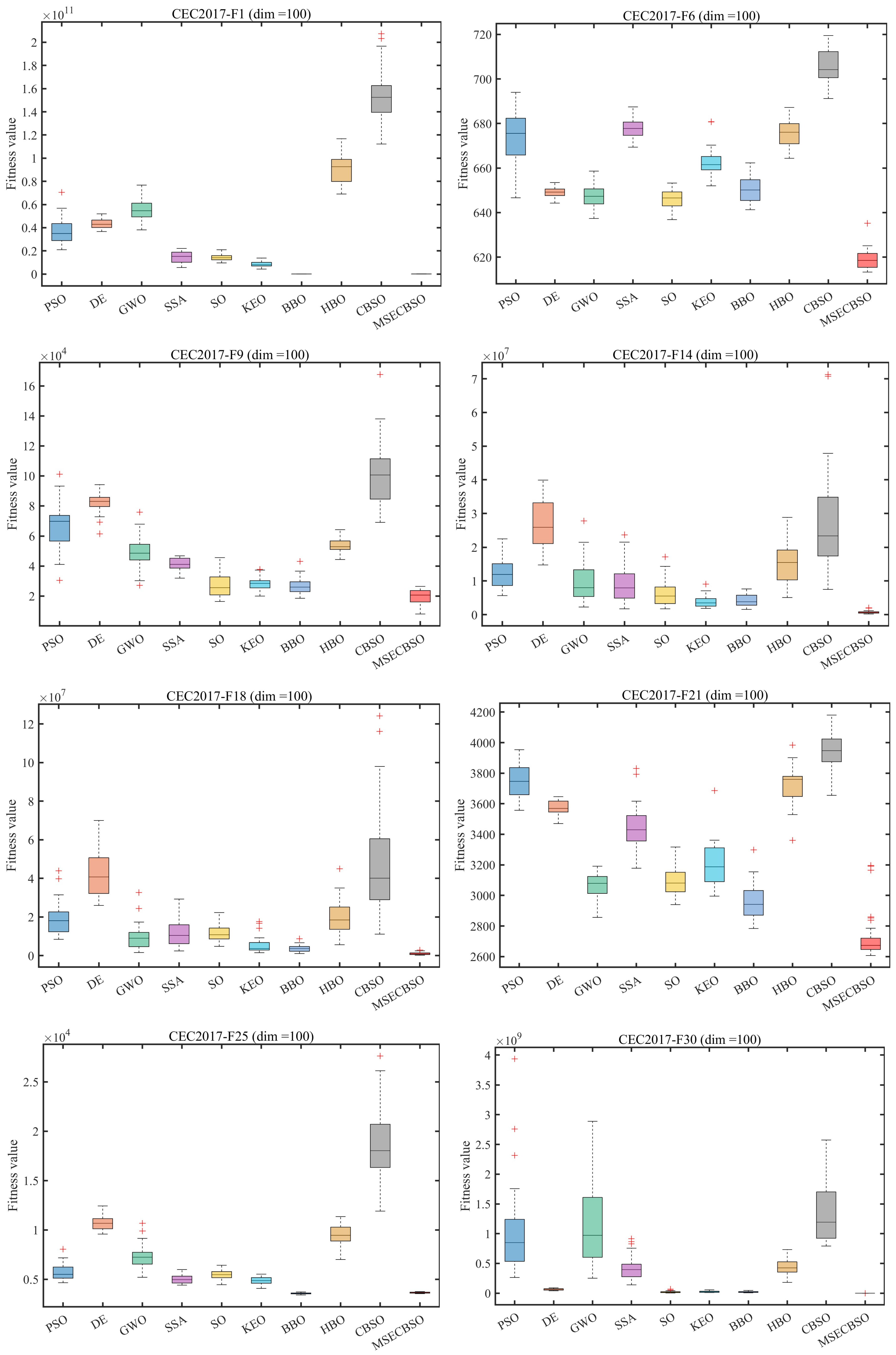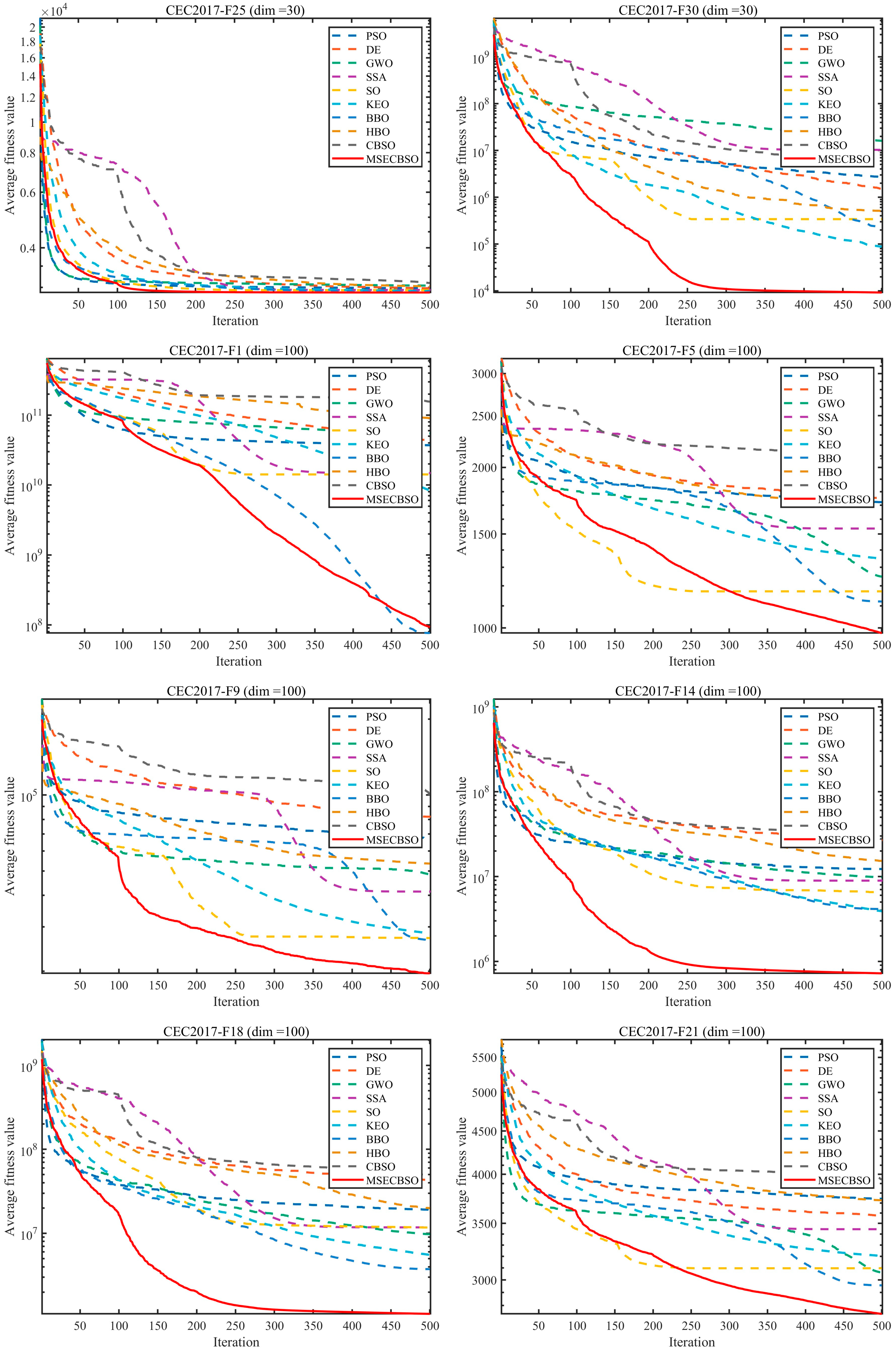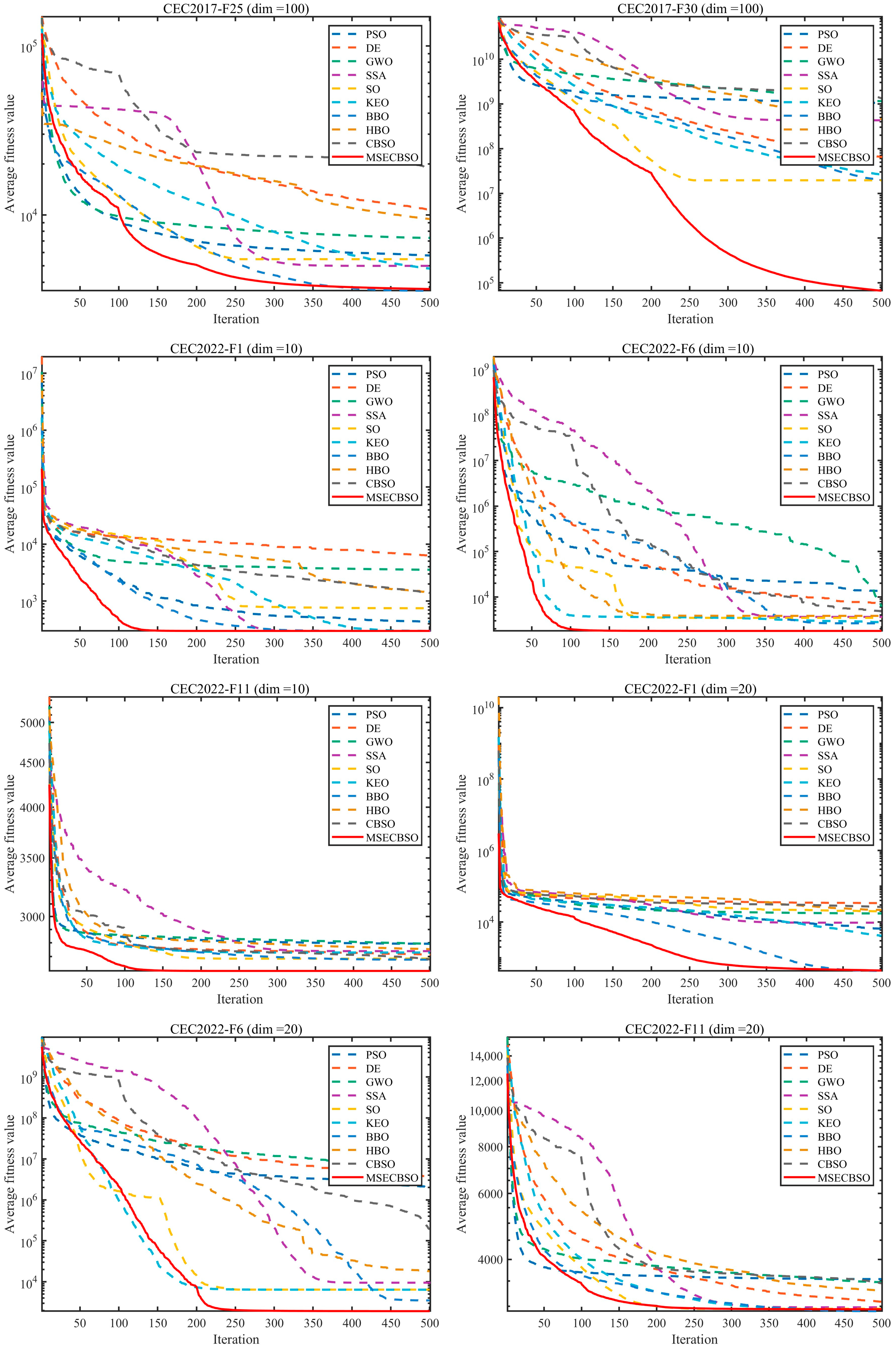 - Extensive experiments on the CEC2017 and CEC2022 benchmark suites, across multiple dimensions and function types, demonstrate that MSECBSO significantly outperforms nine state-of-the-art metaheuristic algorithms in terms of convergence accuracy, speed, and robustness.