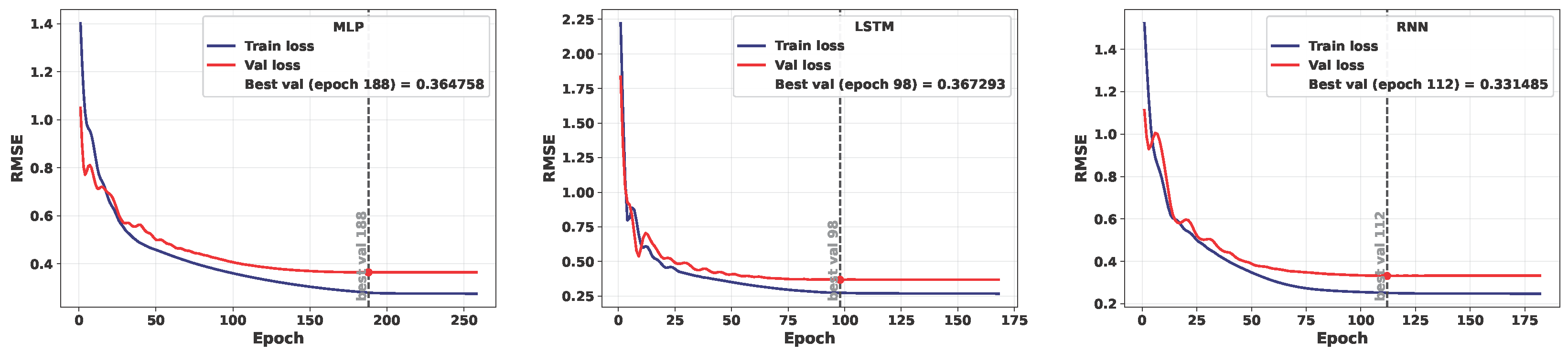 | RNN | Depth/cells () | ; (cells). Fixed: batch , Adam LR , max epochs , patience: 70. Input lags . | Best-by-TSCV (RMSE). (, , ) |