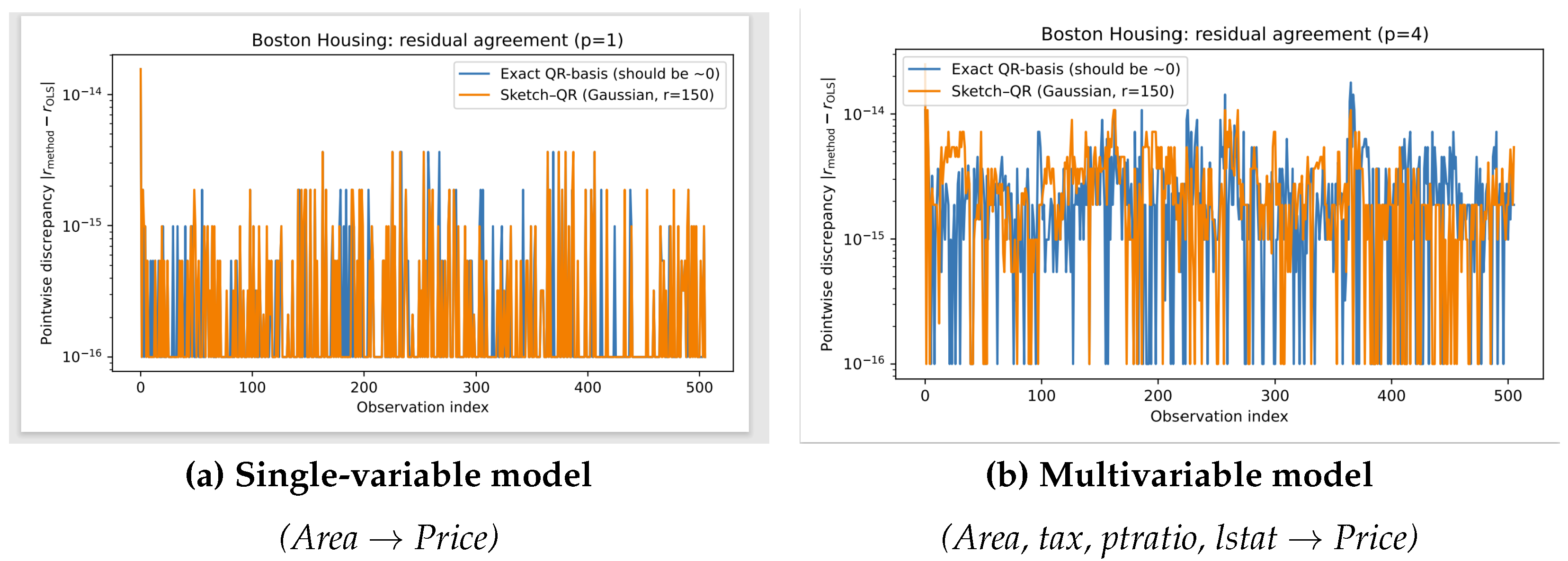 Figure 4 makes the equivalence of the exact geometric projector and classical OLS residuals explicit: the discrepancy curve for the exact QR-basis construction is at a numerical noise level in both the