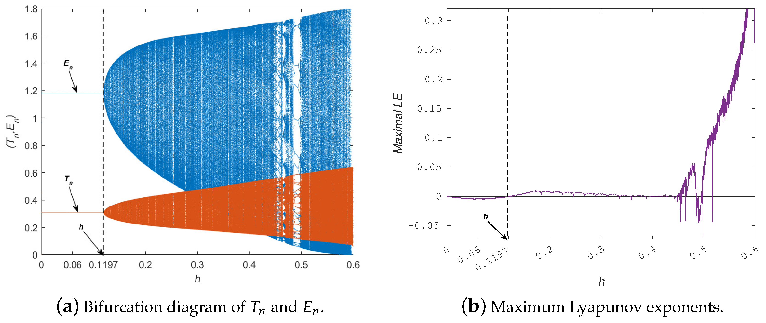 - Here, we utilize the following set of parameter values for the dynamical system described in model (3):together with the initial conditions . The bifurcation parameter h is varied within the interval . At , the system undergoes a Neimark–Sacker bifurcation. At this critical value, the fixed point loses stability, as confirmed by the characteristic polynomial of the Jacobian matrix,The eigenvalues areThese eigenvalues lie on the unit circle at the bifurcation phenomenon. This confirms the existence of a Neimark–Sacker bifurcation.Note that Figure 7 illustrates the bifurcation diagrams of the tumor and effector cell populations together with the corresponding maximum Lyapunov exponent over the interval . It can be seen from Figure 7a that the fixed point of model (3) is locally asymptotically stable for When the parameter exceeds , the fixed point becomes unstable, and a closed invariant curve emerges for This emergence indicates the existence of a Neimark–Sacker bifurcation. This transition is further supported by Figure 7b, where the maximum Lyapunov exponent alternates between negative and positive values, reflecting shifts from stable dynamics to quasi-periodic or chaotic regimes. These results exhibit that even small modifications in the parameter h can have a substantial effect on the behavior of the system, leading to intricate oscillating patterns that could have an effect on the population dynamics over a long time. We show that the strong Allee effect m is a potent bifurcation parameter in Figure 8a,b, producing well-organized and instructive bifurcation diagrams.