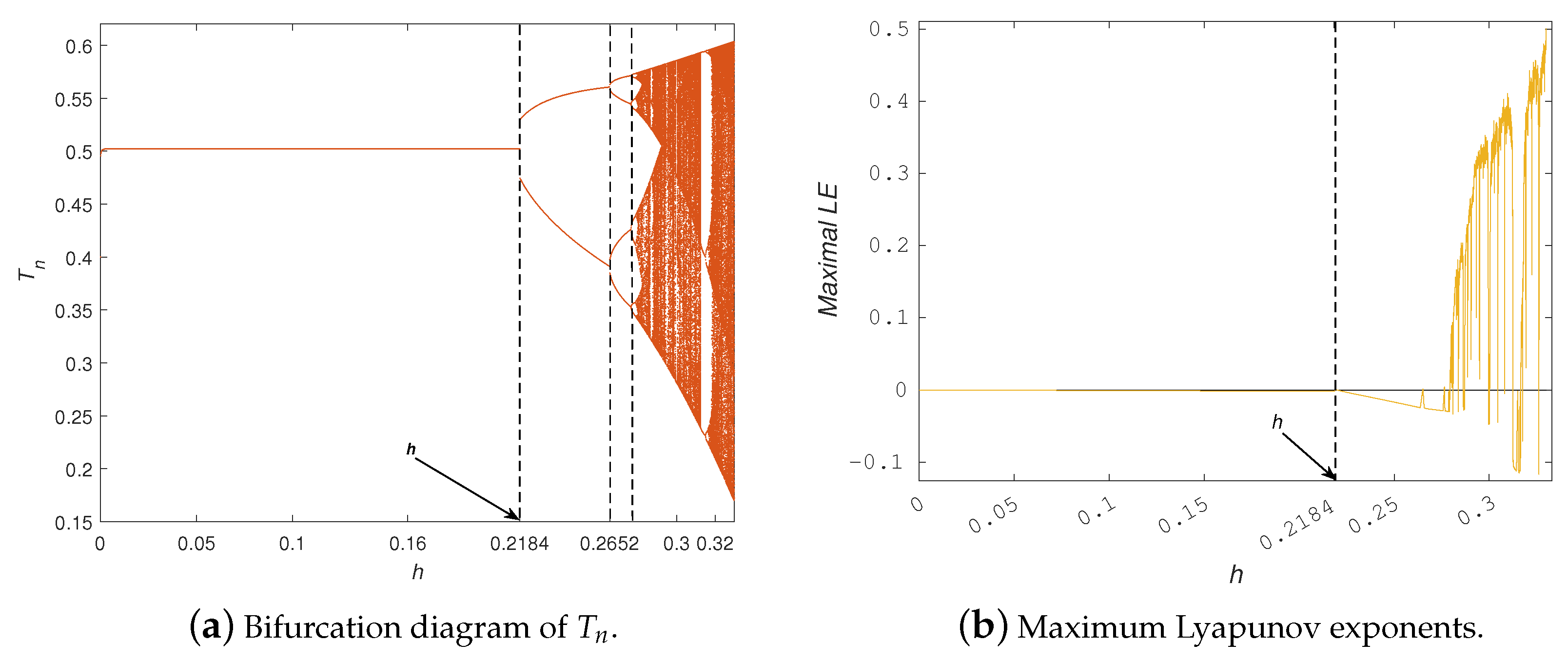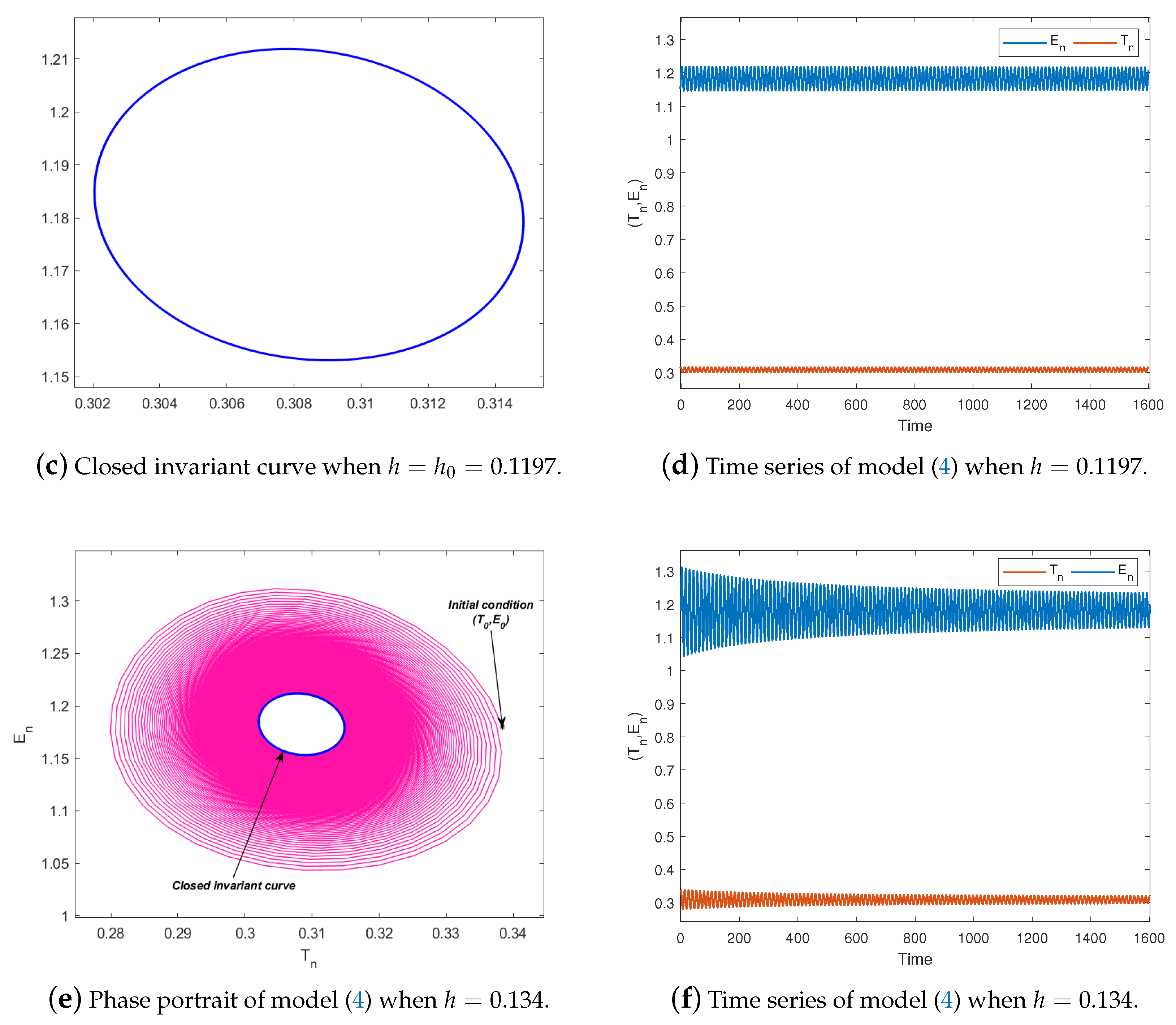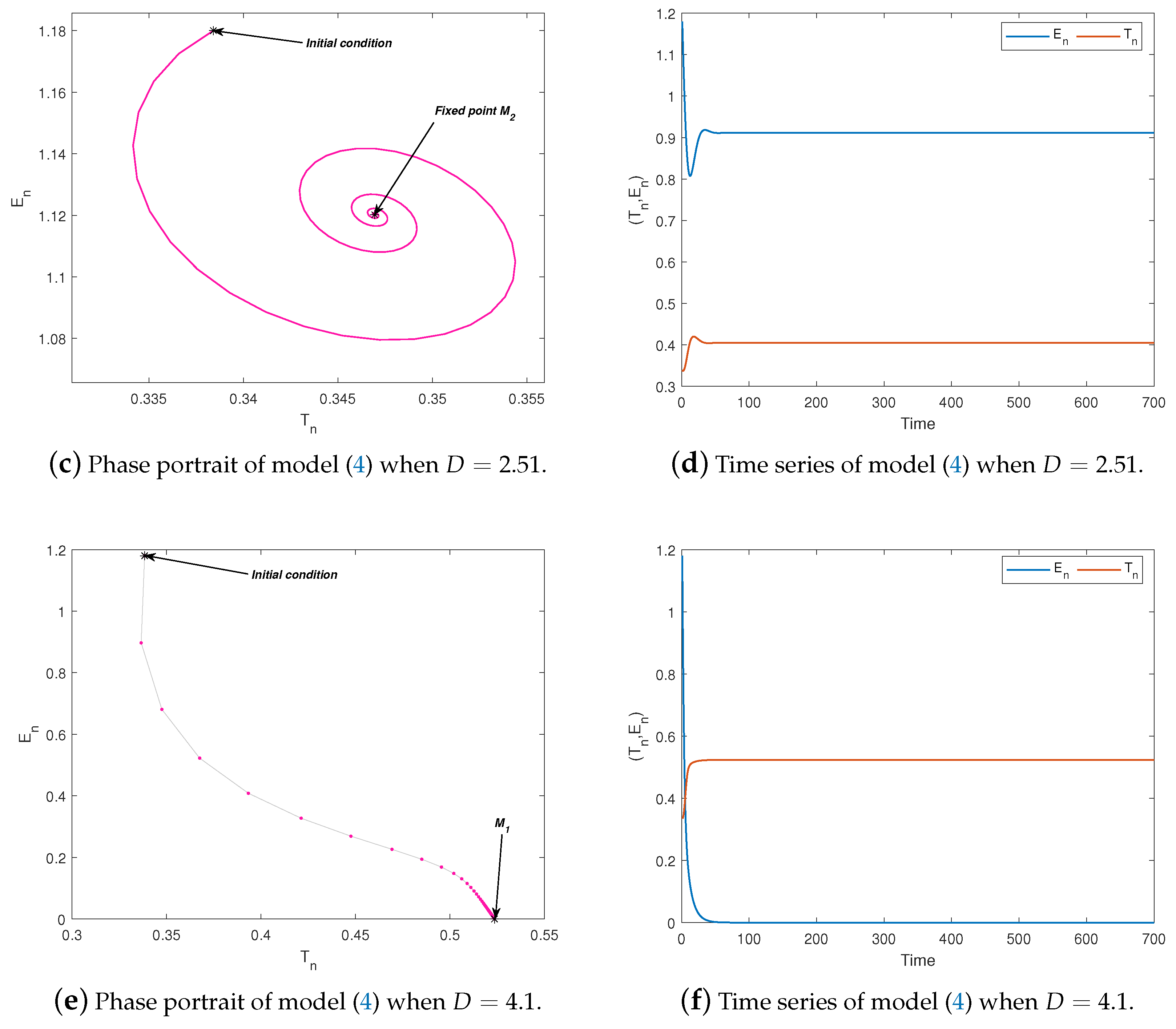 - Assume that the parameter values , and and the initial condition then model (4) undergoes a Neimark–Sacker bifurcation at the fixed point , with serving as the bifurcation parameter. This phenomenon can be clearly seen in Figure 1. Moreover, the bifurcation graphs of model (4) are presented in Figure 1a, while Figure 1b presents the maximum Lyapunov exponent (MLE). A stable fixed point is reached by the tumor and effector cell populations for modest values of h. Quasiperiodic oscillations occur as h approaches a crucial value, producing an invariant closed curve in the phase space. Additional increases in h generate secondary bifurcations, which finally lead to chaotic attractors and periodic orbits. Positive Lyapunov exponents and exceptionally dispersed points in the bifurcation diagrams are symptomatic of these complex dynamics. The Jacobian matrix at the bifurcation point is provided byNote that the corresponding characteristic equation isHence, the eigenvalues of this polynomial arewith magnitude . This verifies that when , the system experiences a Neimark–Sacker bifurcation.The phase portraits and time series plots of system (4) for various values of the bifurcation parameter h are shown in Figure 2 and Figure 3. For , the system exhibits a stable fixed point , as illustrated in Figure 2a,b. When , an attracting invariant closed curve forms around the fixed point (Figure 2c,d), indicating the onset of a Neimark–Sacker bifurcation. For , this closed curve persists and continues to attract nearby trajectories, as seen in Figure 2e,f. As h increases further, periodic orbits appear for instance, at and , illustrated in Figure 3a–d. Eventually, for and , the system enters a chaotic regime, giving rise to chaotic attractors, as shown in Figure 3e–h. The phase portrait representation in Figure 3g further highlights the coupled interactions between tumor and effector cell populations and illustrates how their dynamics evolve as the system approaches chaotic regimes.Figure 4a depicts the bifurcation diagram, while the maximum Lyapunov exponent (MLE) is shown in Figure 4b, with C chosen as the bifurcation parameter. These results are obtained using the parameter set (, , , , , and ) and . It is observed that for , model (4) is asymptotically stable at . Moreover, model (4) undergoes a transcritical bifurcation as C passes through the critical value . At this point, the fixed point loses stability and a new stable fixed point appears. It is worth noting that as C increases, model (4) undergoes a supercritical Neimark–Sacker bifurcation at , beyond which the fixed point loses stability and an attracting invariant closed curve emerges. In addition, the bifurcation diagrams of model (4) are plotted in Figure 5a, and the corresponding maximum Lyapunov exponent (MLE) is demonstrated in Figure 5b. The initial conditions and are used to generate these numerical results, and the parameter D is varied over the interval . Furthermore, Figure 6a,c,e illustrate the phase portraits, and Figure 6b,d,f display the time series of model (4) for several representative values of D. We also observe that Figure 6c,e demonstrate that for parameter values , the fixed point remains locally asymptotically stable. At the critical value , loses stability and vanishes, while a new stable fixed appears (see Figure 6e,f, indicating that the model (4) undergoes a transcritical bifurcation. For , an invariant closed curve emerges around , whose radius increases as D moves away from the bifurcation value. This phenomenon arises from a subcritical Neimark–Sacker bifurcation occurring at (see Figure 6a,b).