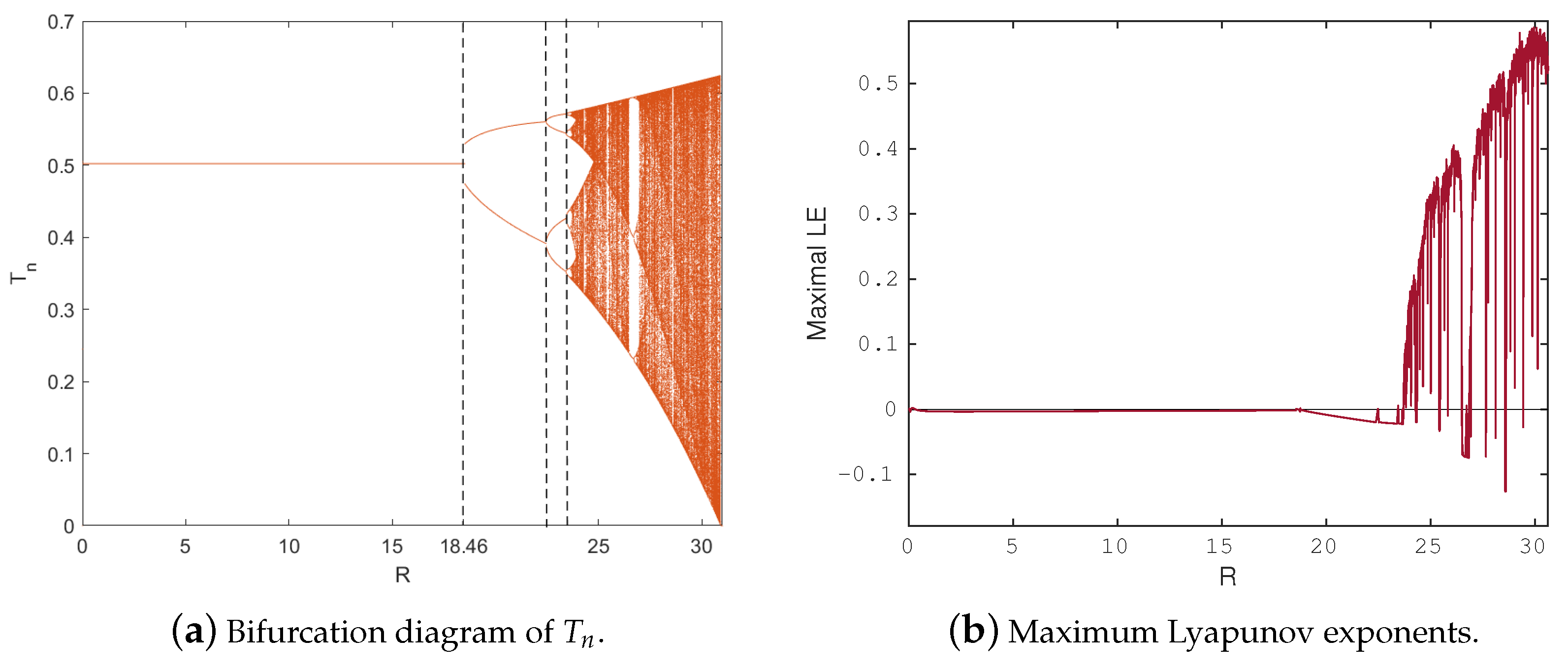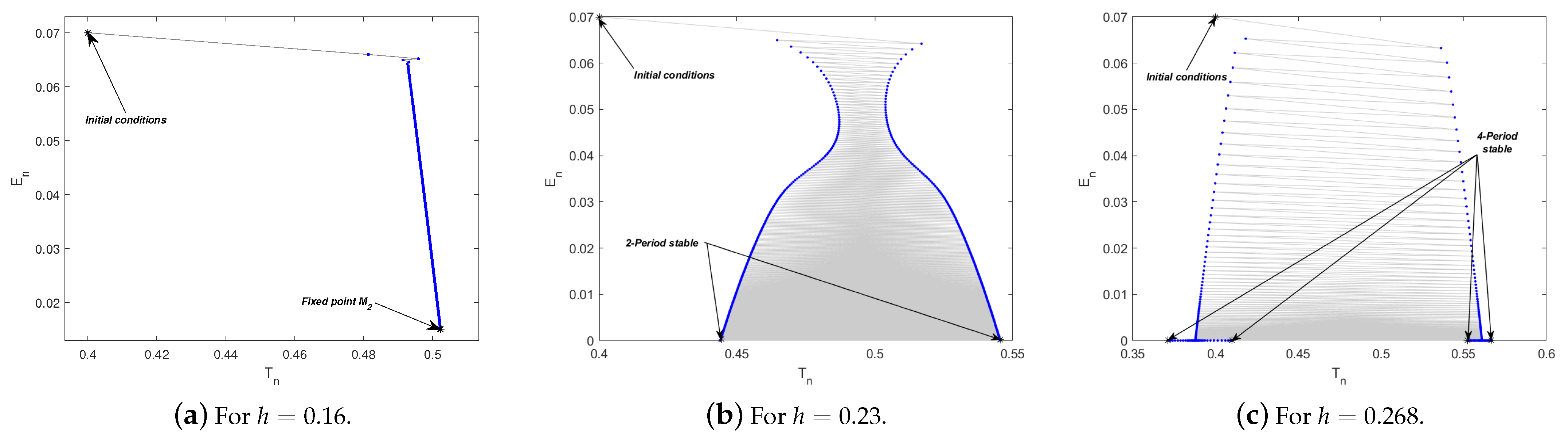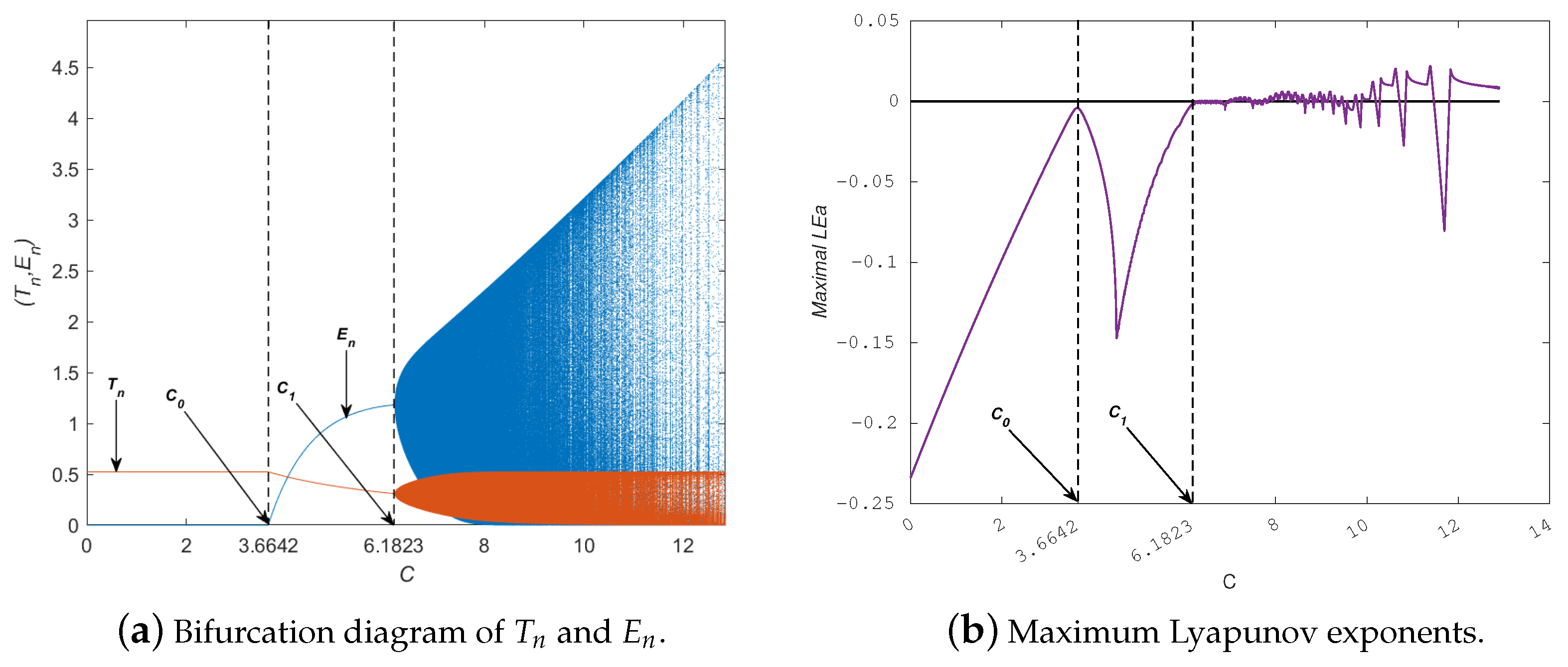 - Assume that the parameter values , and and the initial condition then model (4) undergoes a Neimark–Sacker bifurcation at the fixed point , with serving as the bifurcation parameter. This phenomenon can be clearly seen in Figure 1. Moreover, the bifurcation graphs of model (4) are presented in Figure 1a, while Figure 1b presents the maximum Lyapunov exponent (MLE). A stable fixed point is reached by the tumor and effector cell populations for modest values of h. Quasiperiodic oscillations occur as h approaches a crucial value, producing an invariant closed curve in the phase space. Additional increases in h generate secondary bifurcations, which finally lead to chaotic attractors and periodic orbits. Positive Lyapunov exponents and exceptionally dispersed points in the bifurcation diagrams are symptomatic of these complex dynamics. The Jacobian matrix at the bifurcation point is provided byNote that the corresponding characteristic equation isHence, the eigenvalues of this polynomial arewith magnitude . This verifies that when , the system experiences a Neimark–Sacker bifurcation.The phase portraits and time series plots of system (4) for various values of the bifurcation parameter h are shown in Figure 2 and Figure 3. For , the system exhibits a stable fixed point , as illustrated in Figure 2a,b. When , an attracting invariant closed curve forms around the fixed point (Figure 2c,d), indicating the onset of a Neimark–Sacker bifurcation. For , this closed curve persists and continues to attract nearby trajectories, as seen in Figure 2e,f. As h increases further, periodic orbits appear for instance, at and , illustrated in Figure 3a–d. Eventually, for and , the system enters a chaotic regime, giving rise to chaotic attractors, as shown in Figure 3e–h. The phase portrait representation in Figure 3g further highlights the coupled interactions between tumor and effector cell populations and illustrates how their dynamics evolve as the system approaches chaotic regimes.Figure 4a depicts the bifurcation diagram, while the maximum Lyapunov exponent (MLE) is shown in Figure 4b, with C chosen as the bifurcation parameter. These results are obtained using the parameter set (, , , , , and ) and . It is observed that for , model (4) is asymptotically stable at . Moreover, model (4) undergoes a transcritical bifurcation as C passes through the critical value . At this point, the fixed point loses stability and a new stable fixed point appears. It is worth noting that as C increases, model (4) undergoes a supercritical Neimark–Sacker bifurcation at , beyond which the fixed point loses stability and an attracting invariant closed curve emerges. In addition, the bifurcation diagrams of model (4) are plotted in Figure 5a, and the corresponding maximum Lyapunov exponent (MLE) is demonstrated in Figure 5b. The initial conditions and are used to generate these numerical results, and the parameter D is varied over the interval . Furthermore, Figure 6a,c,e illustrate the phase portraits, and Figure 6b,d,f display the time series of model (4) for several representative values of D. We also observe that Figure 6c,e demonstrate that for parameter values , the fixed point remains locally asymptotically stable. At the critical value , loses stability and vanishes, while a new stable fixed appears (see Figure 6e,f, indicating that the model (4) undergoes a transcritical bifurcation. For , an invariant closed curve emerges around , whose radius increases as D moves away from the bifurcation value. This phenomenon arises from a subcritical Neimark–Sacker bifurcation occurring at (see Figure 6a,b).