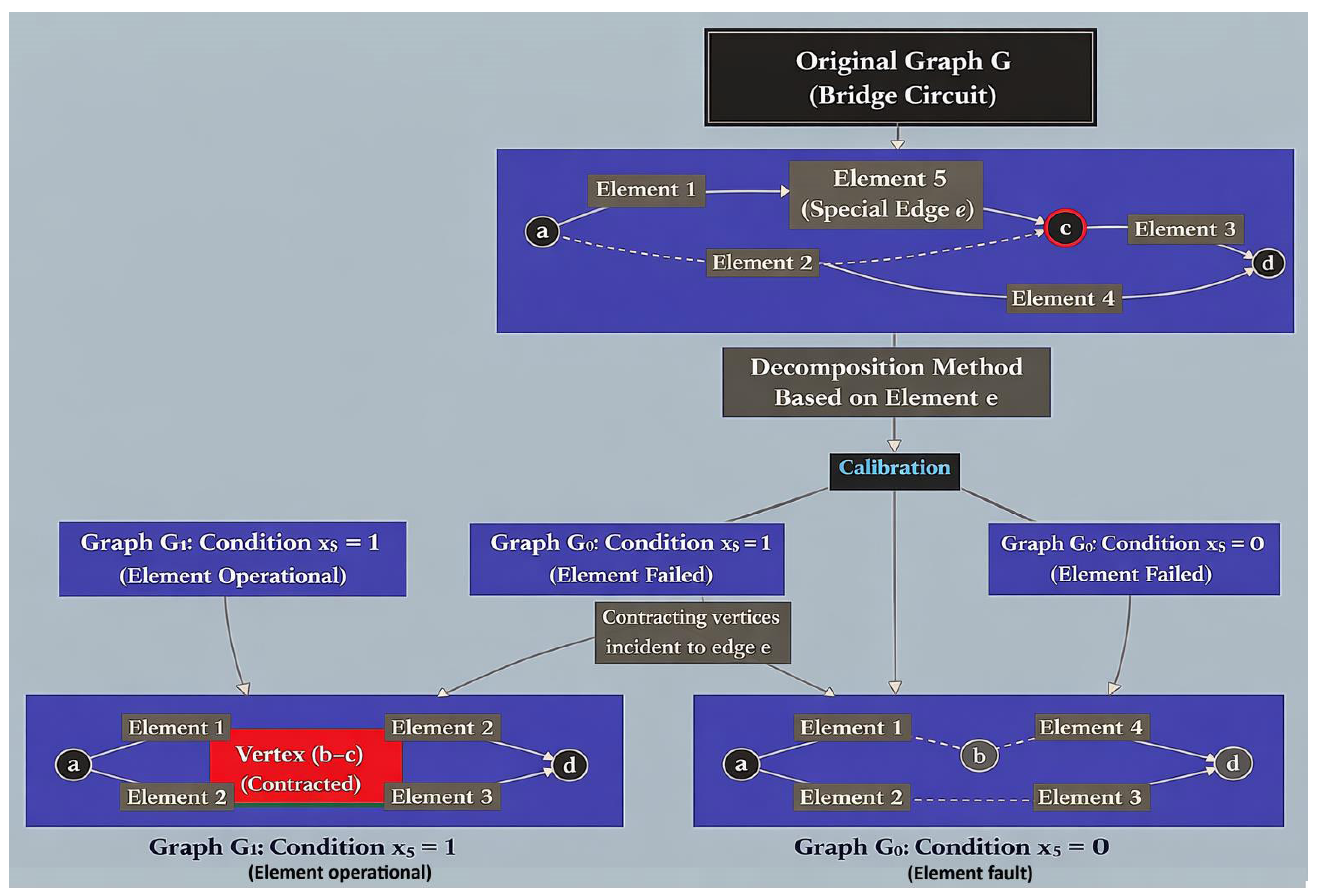 - Anomaly of the decomposition method. The result of the decomposition method (0.994975) was significantly underestimated. A detailed analysis showed that the error accumulates at the stage of calculating P(A|H2) (failure probability 3), where an approximate calculation for a simplified subsystem was applied. This emphasizes the sensitivity of this method to the accuracy of intermediate calculations and the choice of a “special” element.