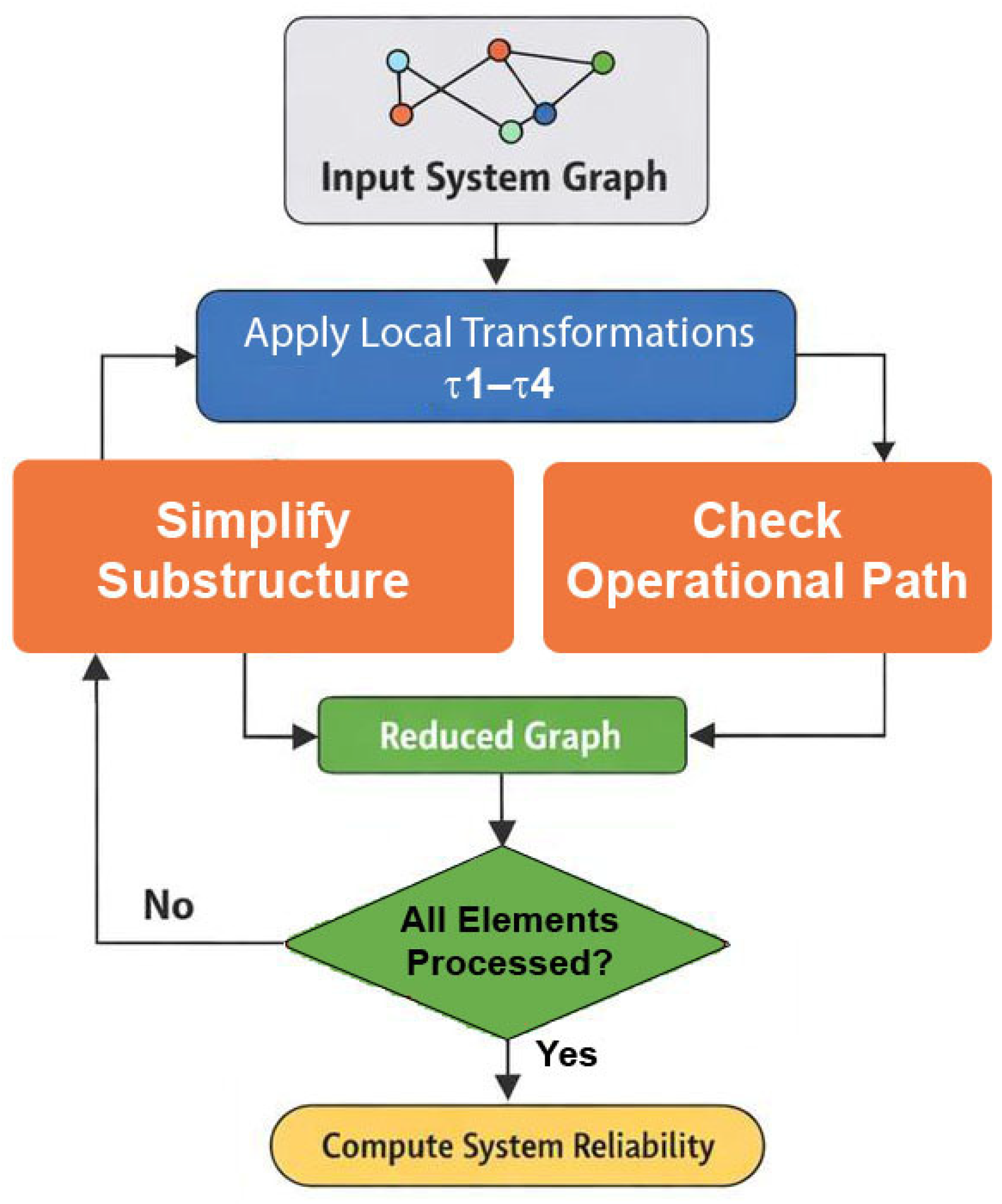 - τ2 (Convolution of successive edges): If there is a vertex V of degree 2 that is incidental to edges (u,v) and (v,w), then these edges are replaced by one equivalent edge (v,w) with a probability of ruw = ruv·rvw.