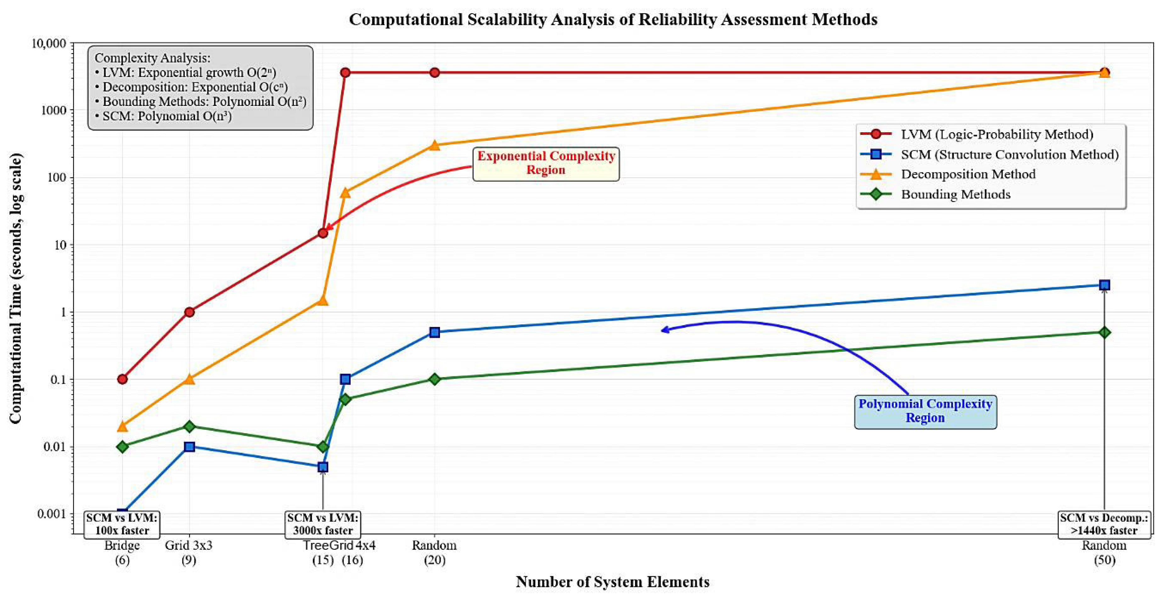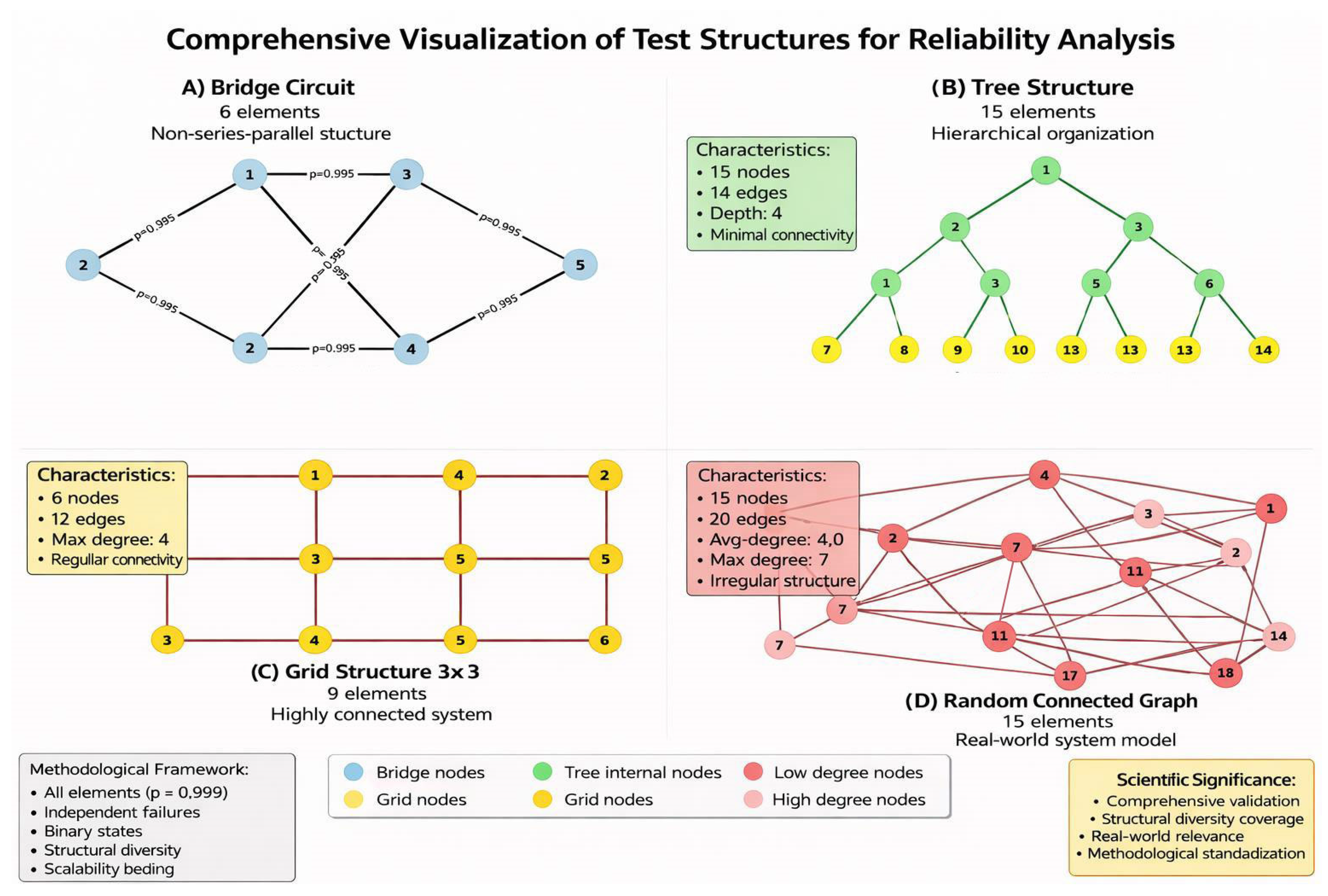 - A series of computational experiments on representative test structures (bridge, tree, lattice, random graph) with fixed parameters p = 0.995 to quantify the accuracy, calculation time, and scalability of each method.
