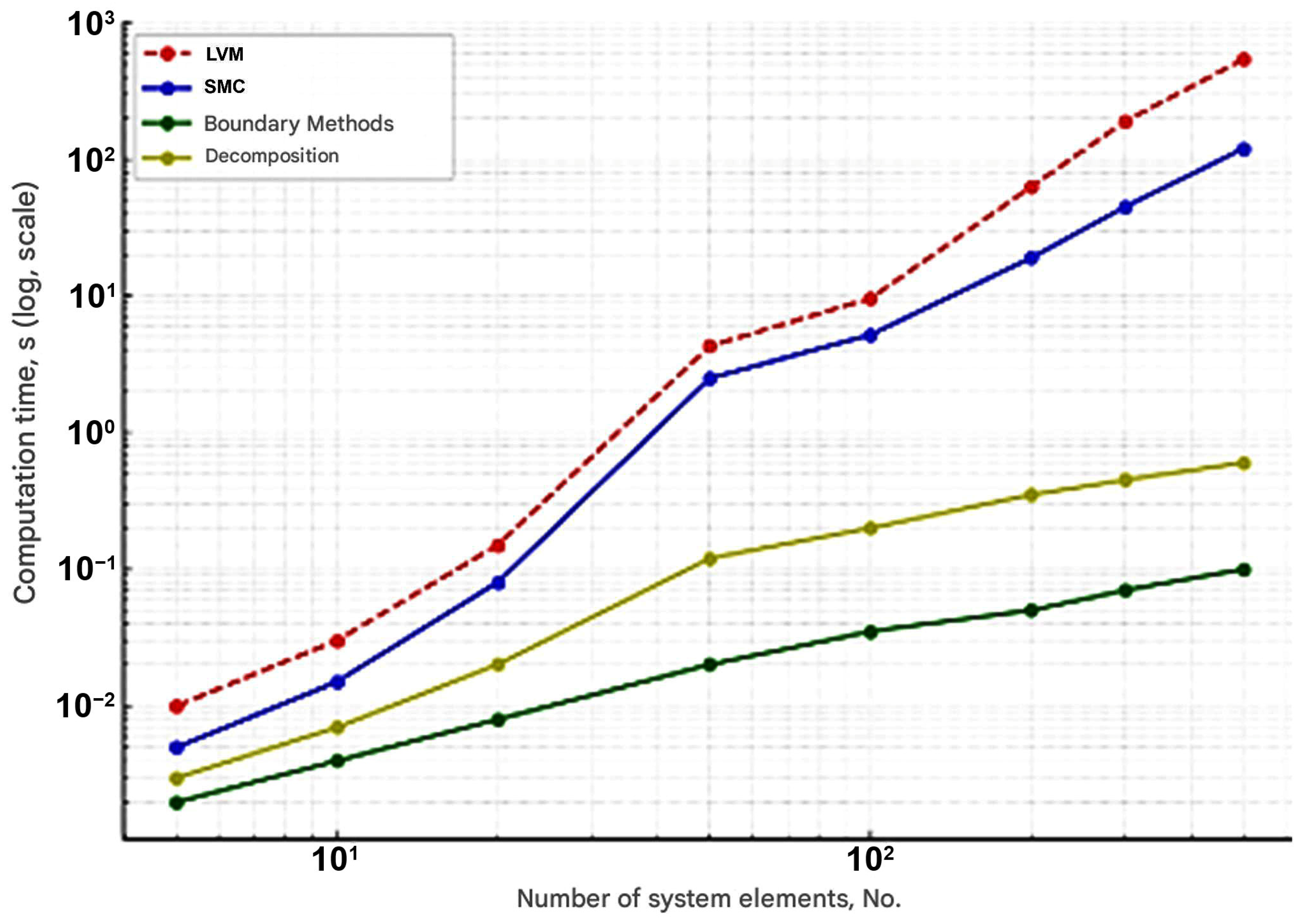 - Compare computational efficiency. The SCM demonstrated the highest calculation speed, surpassing the LVM by more than 100 times even for a simple 6-element scheme. This is due to the fact that LVM requires analytical transformation and symbolic calculations, while SCM operates exclusively with numerical matrix operations.