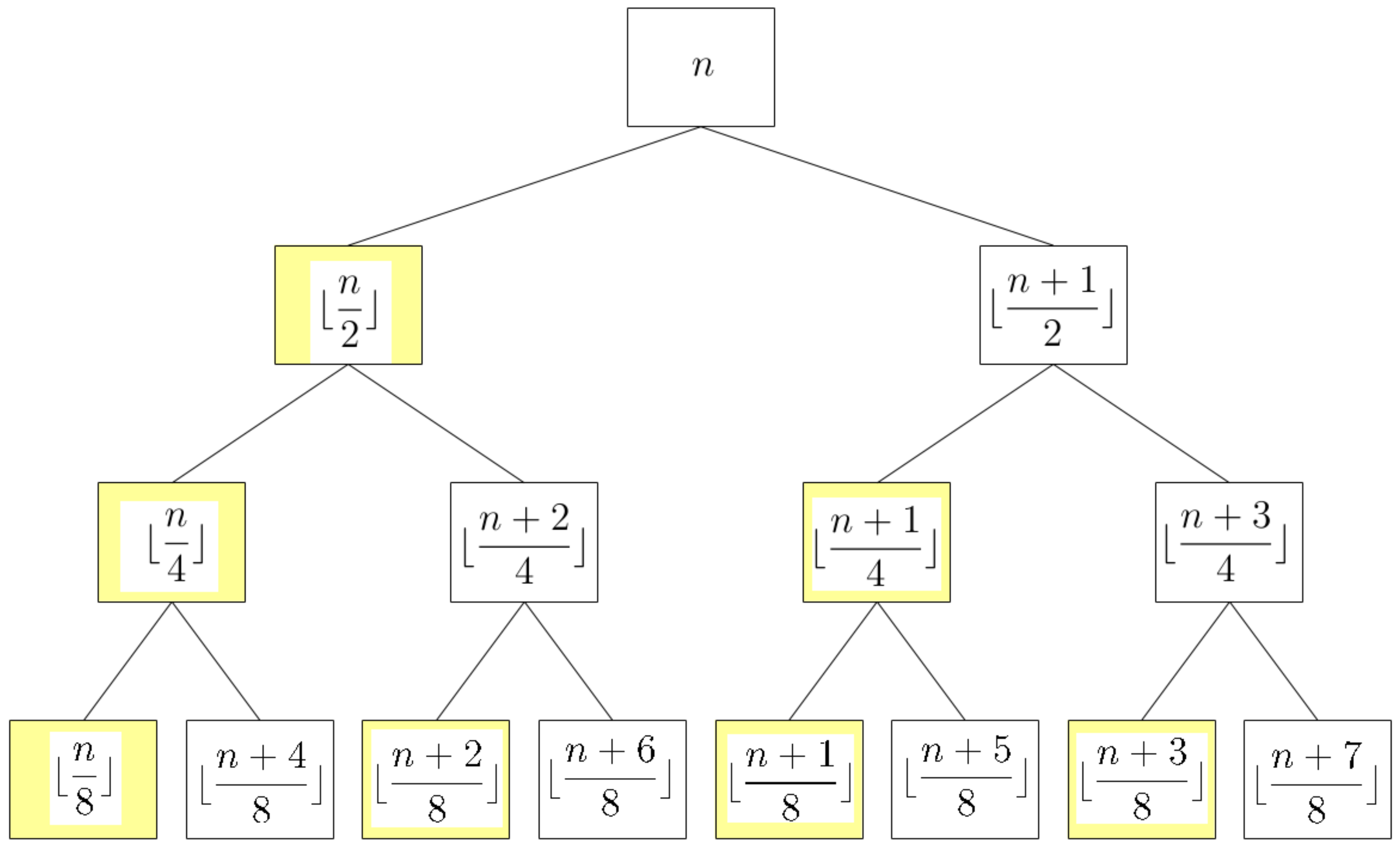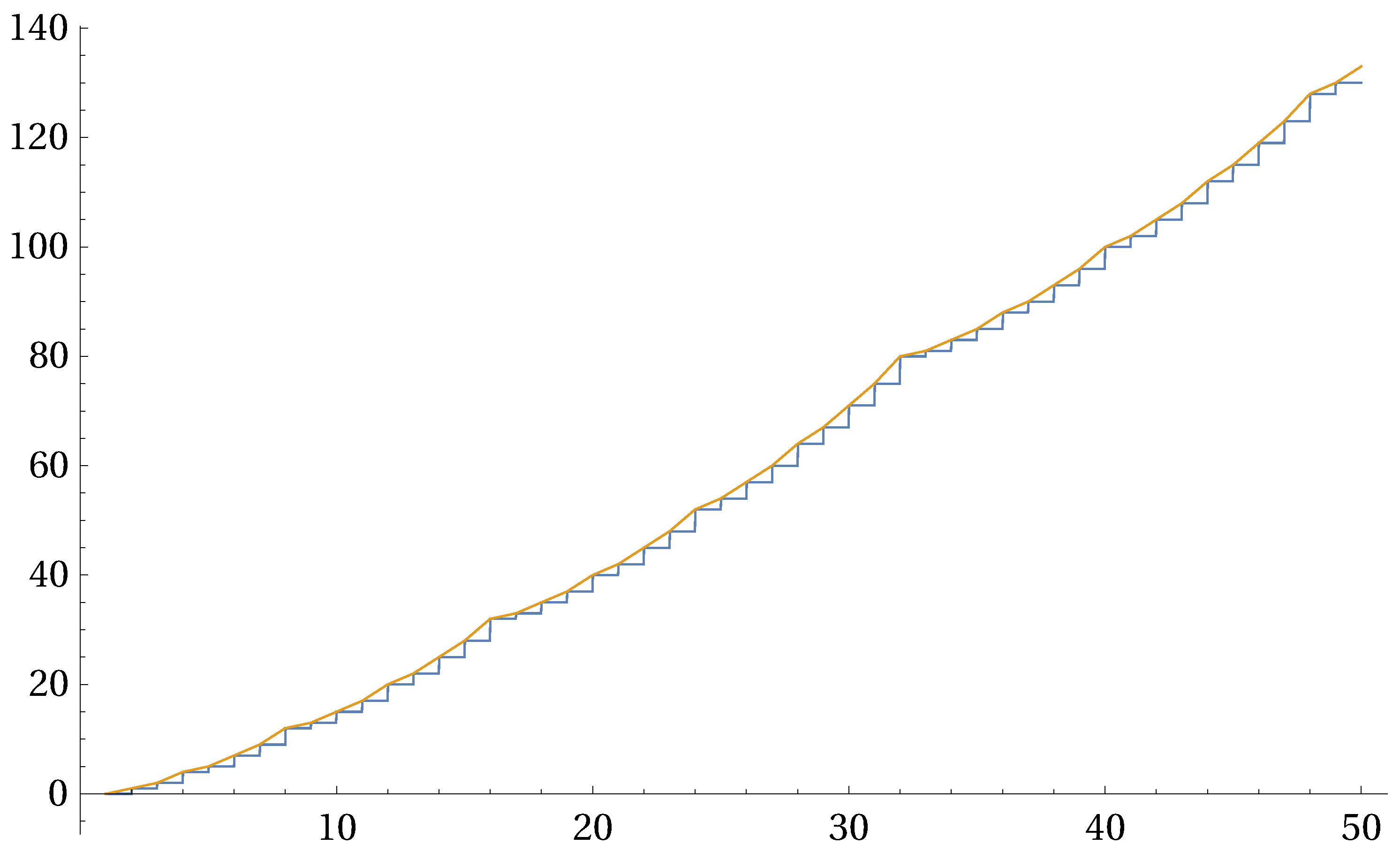 Note 1. Since the total number of significant bits in binary representations of all numbers between 1 and n is equal to + 1), the direct counting of 1s in all those numbers requires at least or, by virtue of Stirling’s formula, steps that take time to carry them on, which is significantly more than the time that is sufficient for the evaluation of Formula (15) derived and proved in this article. Note 2. A student of mine was once trying to convince me that the number of comparisons of keys that performs in the worst case was exactly equal to twice the number it performed in the best case. In order to show her why it was not exactly the case, I experimentally derived an exact formula for it. This is how I got into writing this article.