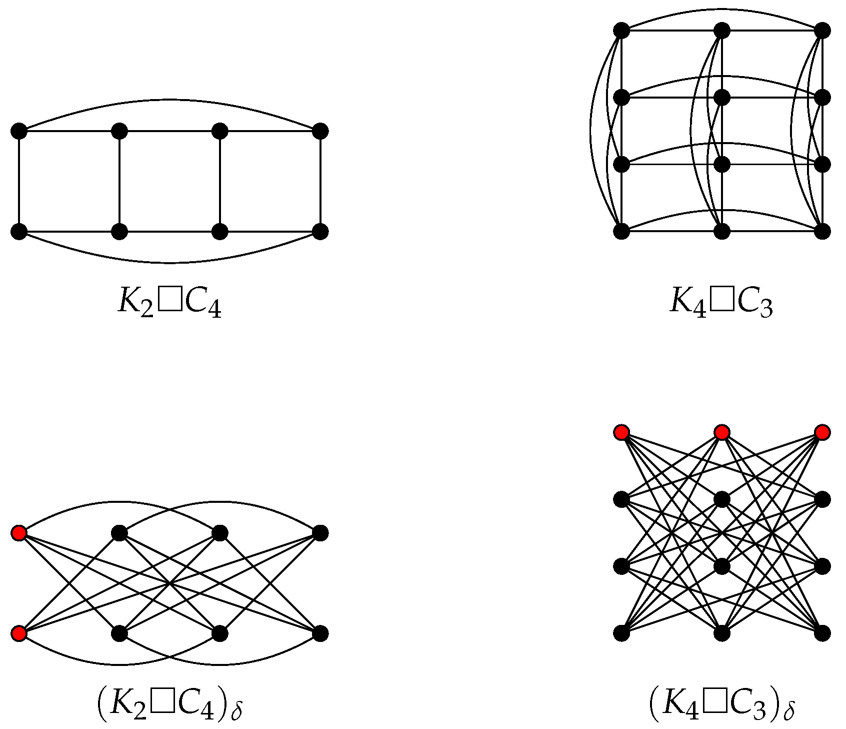 Example 2. Let be a path graph with and and be a path graph with and . We see that Graphs G and H satisfy the condition in Theorem 9. Hence, . In fact, as vertex dominates . See Figure 2 for an illustration. When G and H are regular, is also regular, which implies that . Thus, . This yields the result in Theorem 10. Despite the simplicity of its proof, we have not found this result in any of the literature, to our knowledge. Hence, we present it here. (This is the same for the case of the Cartesian product where when G and H are regular and the results are present in Lemmas 5–7 and Corollary 2.)
