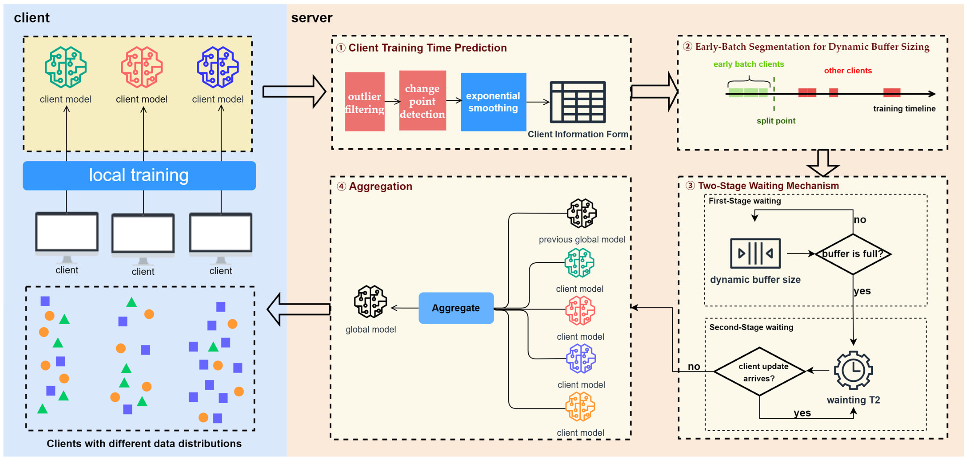 - We propose an adaptive method for predicting client completion times to optimize aggregation scheduling. This approach uses a refined exponential smoothing prediction model, with key innovations including outlier filtering and change-point detection. This combined design offers robust predictions that are resistant to outlier interference while maintaining continuous adaptability to dynamic environmental changes.