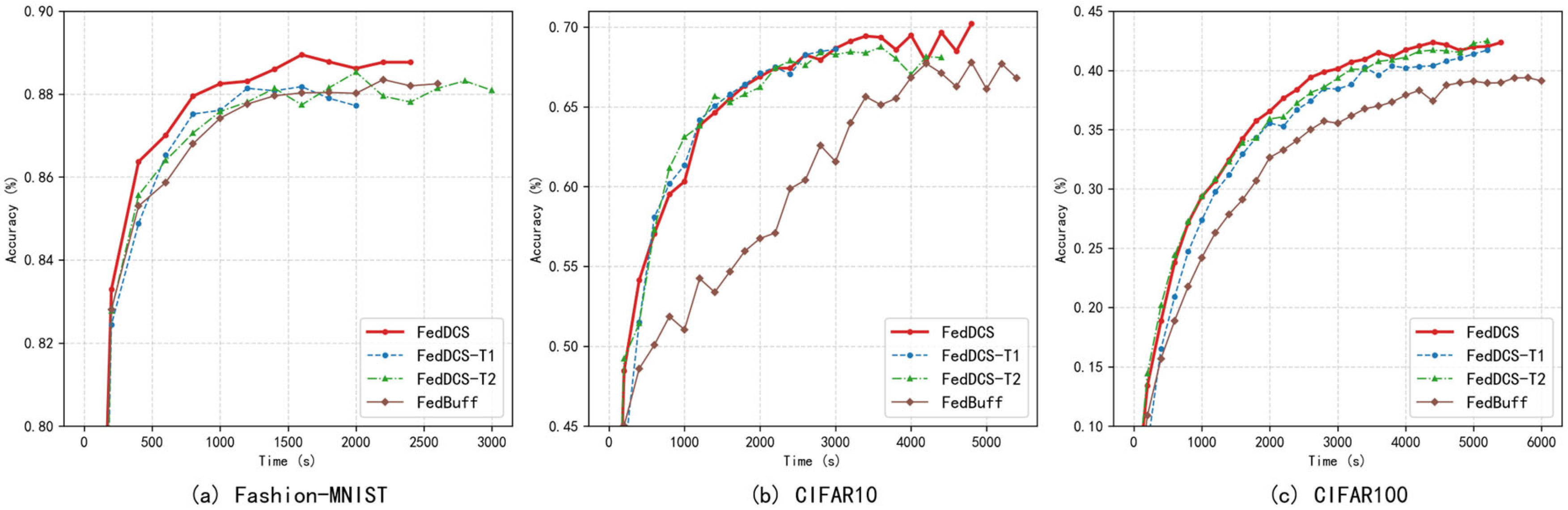 - The first-stage waiting mechanism ensures baseline time efficiency. On simpler tasks such as Fashion-MNIST, FedDCS-T1 achieves higher early-stage efficiency than FedBuff and FedDCS-T2. However, on the complex CIFAR-100 task, it underperforms relative to FedDCS-T2 and the full FedDCS. This indicates that dynamically adjusting the buffer size based on client progress is effective at adapting to common performance variations and avoiding the inefficiencies of a fixed buffer. Nonetheless, its standalone contribution is limited, particularly in handling dynamic environmental changes.