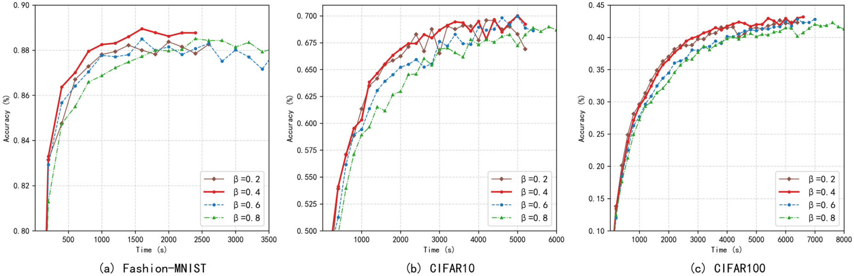 - Synergistic effect for optimal performance. The complete FedDCS strategy achieves the best overall performance across all three datasets. It leads comprehensively in both time efficiency and final accuracy on Fashion-MNIST and CIFAR-100. On CIFAR-10, it achieves the highest convergence rate while reaching peak accuracy. These results demonstrate a clear synergistic effect: the first-stage waiting mechanism establishes an efficient, adaptive scheduling foundation, while the second-stage waiting mechanism performs refined optimization on this basis. This combination is crucial for robust performance in environments with compounded device and data heterogeneity.