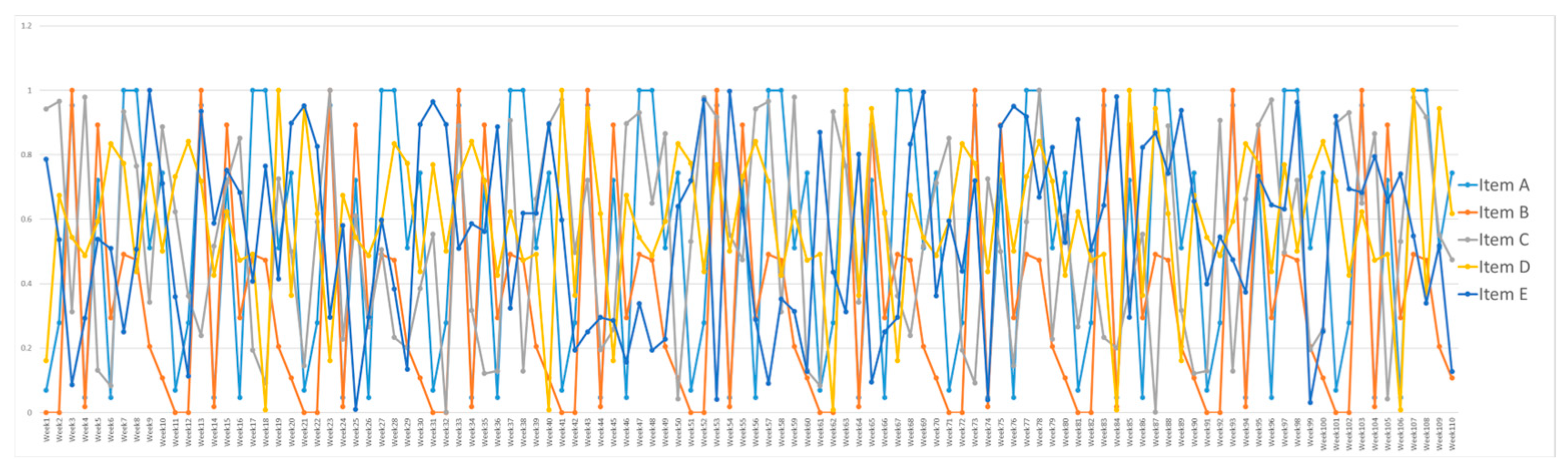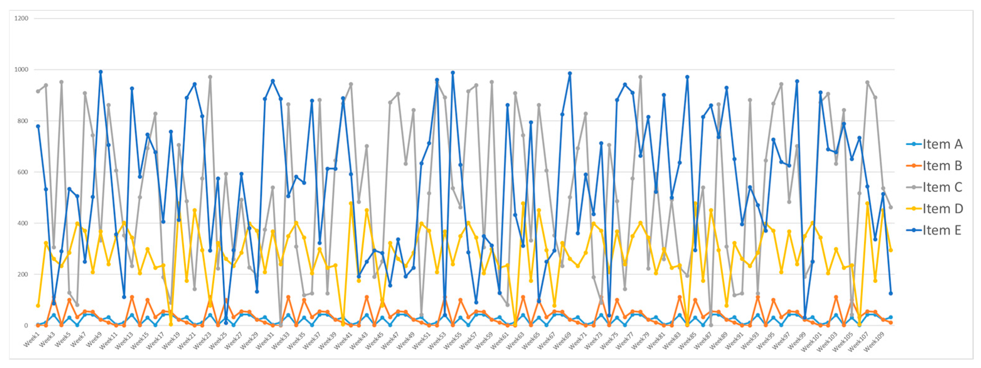 The analysis was conducted on multiple weekly time series for five items denoted as A through E. All series were preprocessed individually to ensure numerical stability and comparability across items. Each time series was normalized to the interval [0, 1] using a normalization function, where the minimum value was fixed at zero, and the maximum was defined by the observed peak value. This normalization reflects realistic production conditions, where zero usage may occur at any time, and was also required to ensure stable and efficient LSTM training, particularly for items with large amplitude variation.