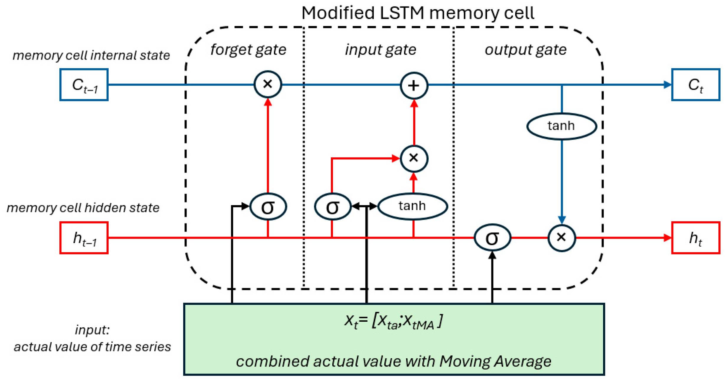 The first and most substantial modification is the introduction of a moving average representation as an additional input feature alongside the raw time series as a second dimensional input (Xt = [Xta;XtMA]). This modification represents a data representation strategy rather than a change to the LSTM cell itself. The moving average was computed using a strictly causal rolling window, ensuring that only past information was used and preventing any form of information leakage. By explicitly providing a smoothed trend component, the network was relieved from learning basic low frequency structure directly from noisy observations. This is particularly important in small datasets with large outliers, where jointly learning trend and volatility can lead to unstable parameter updates and poor generalization.