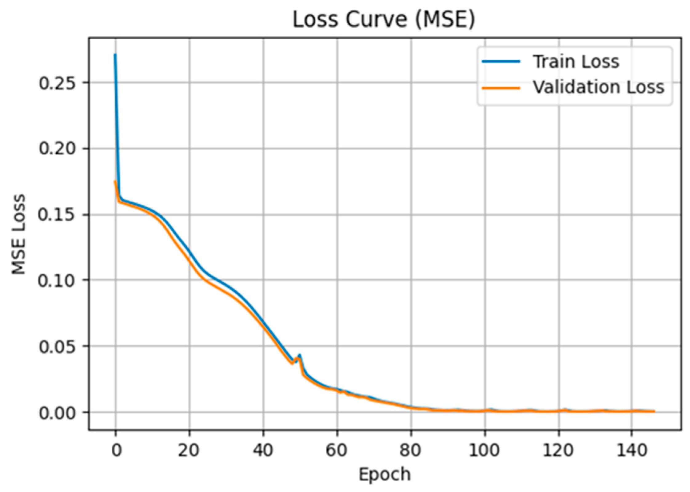 Figure 4, the loss curves display a smooth and monotonic decrease for both training and validation error, with the two curves closely aligned throughout the training process. This indicates stable convergence and the absence of overfitting, as no divergence between training and validation loss is observed. The rapid reduction in mean squared error in the early epochs suggests that the dominant temporal structure is learned efficiently, while the gradual flattening at later epochs reflects fine scale adjustment rather than unstable optimization.