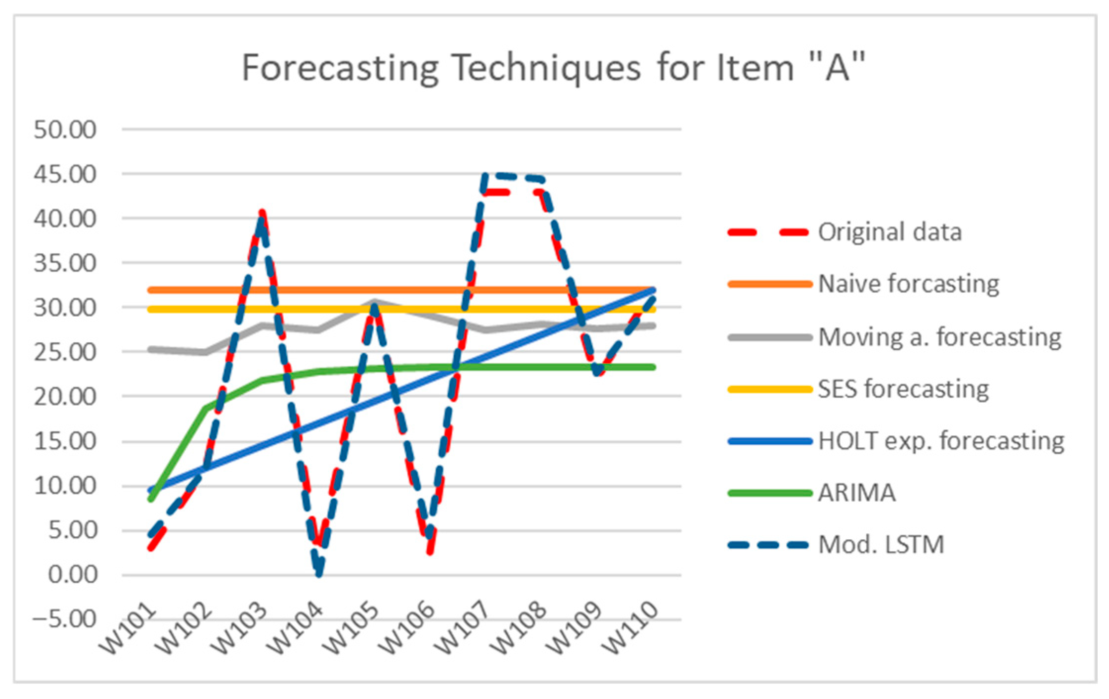 Figure 12. These series are characterized by weaker structure and higher noise levels, and the modified LSTM does not achieve the lowest error. Instead, the Holt exponential smoothing method yields the best performance across all three items. This suggests that for irregular or moderately structured series, simpler statistical models with explicit trend handling can be more robust than learning-based approaches.