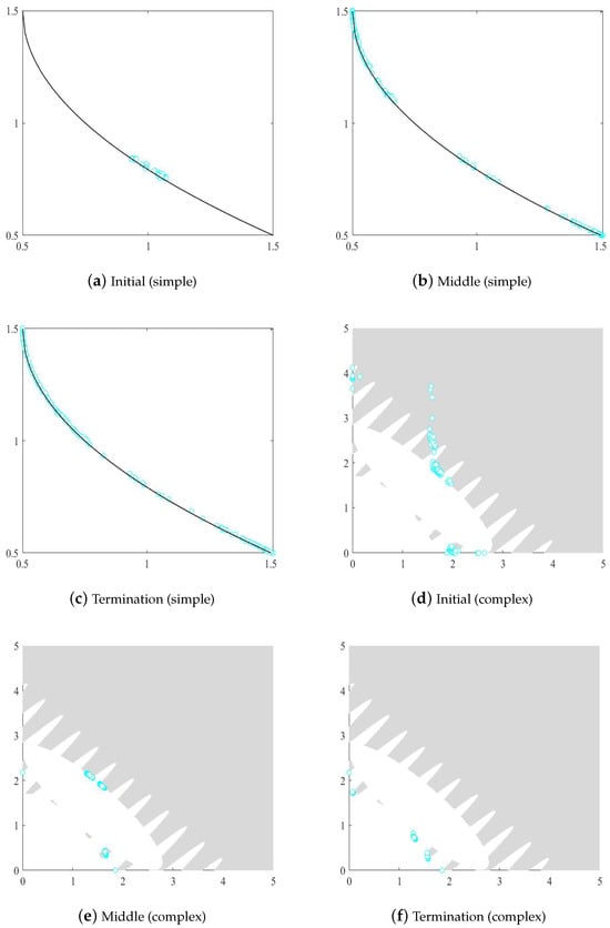 The above issues can be further illustrated through the visualization of the evolutionary search process, as shown in Figure 1. In this figure, the gray region denotes the feasible region, the white region denotes the infeasible region, and cyan circles indicate feasible solutions in the population. During the initial stage (Figure 1a,d), the population is mainly confined to local feasible regions due to limited exploration capability, making it difficult to cross infeasible barriers. In the middle stage (Figure 1b,e), the adaptive constraint-tightening strategy progressively guides individuals across infeasible regions, enabling the population to explore potential feasible trajectories and expand toward different constrained Pareto fronts (CPFs). At the termination stage (Figure 1c,f), most solutions reside within the feasible region, with a substantial proportion converging toward the leading edge of the CPF, illustrating the algorithm’s effectiveness in achieving both convergence and diversity. Notably, the top row of subfigures represents a simplified scenario, while the bottom row illustrates the algorithm’s behavior in a more complex constrained environment, highlighting the robustness of the proposed method across varying problem difficulties.