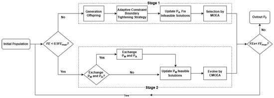 In parallel, multi-stage [21,22] and adaptive evolutionary frameworks [23,24] have emerged as effective solutions for handling complex CMOPs. By dividing the optimization process into different stages with distinct search objectives, such algorithms can guide populations from infeasible regions toward feasible regions and subsequently focus on CPF refinement [25,26]. Archive-assisted strategies [27,28] and differential evolution (DE) operators have also been widely integrated to enhance convergence accuracy and robustness under constrained environments.