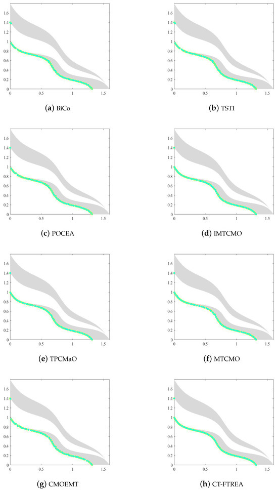 Furthermore, Figure 3 illustrates the solution distributions obtained on the MW6 problem, where the gray region represents the feasible space, the gray curve denotes the CPF, and the blue points correspond to feasible solutions. It can be observed that the solutions generated by CT-FTREA are distributed continuously and uniformly along the feasible boundary. In contrast, several competing algorithms, such as TSTI, POCEA, IMTCMO, and MTCMO, exhibit noticeable gaps or deviations in certain regions, reflecting limitations in their constraint-handling and search stability.