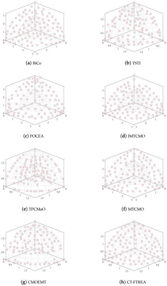 - CT-FTREA3: The elite environmental selection strategy is removed, retaining only the basic selection operator. This experiment analyzes the impact of elite environmental selection on the stability of the solution set, convergence, and the approximation ability of the Pareto front.