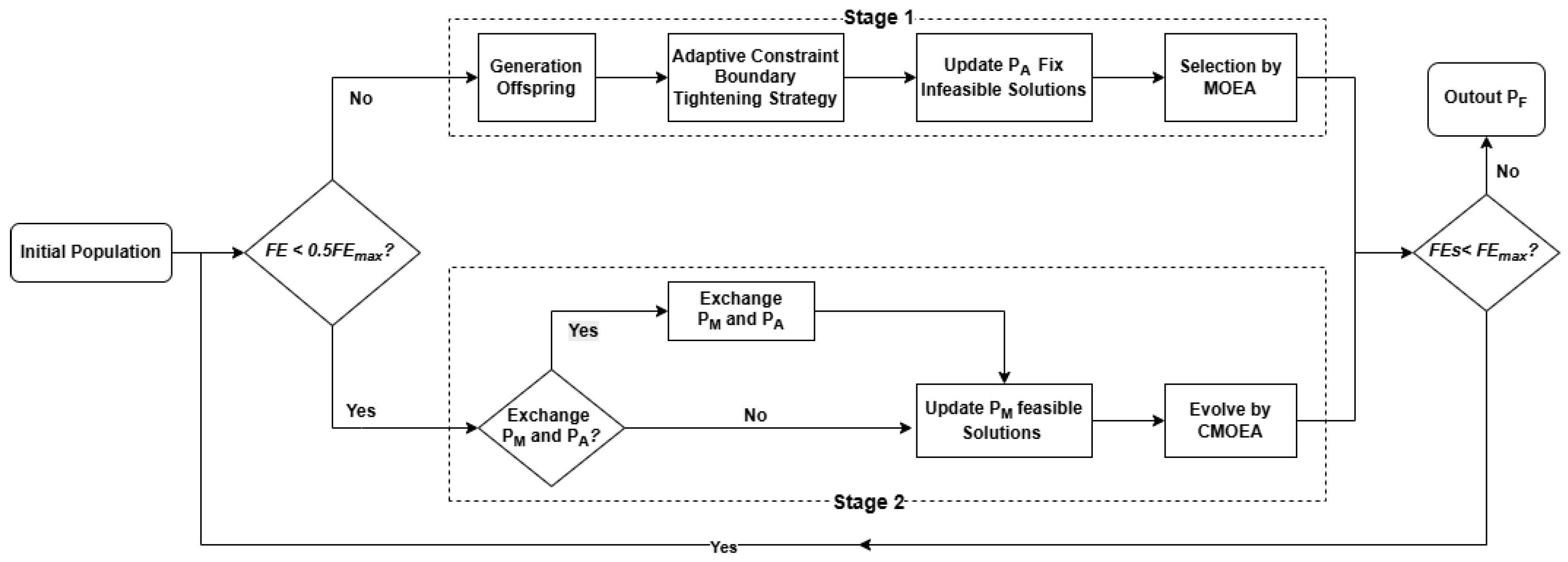 - Ming, M.; Wang, R.; Ishibuchi, H.; Zhang, T. A Novel Dual-Stage Dual-Population Evolutionary Algorithm for Constrained Multiobjective Optimization. IEEE Trans. Evol. Comput. 2021, 26, 1129–1143. [Google Scholar] [CrossRef]