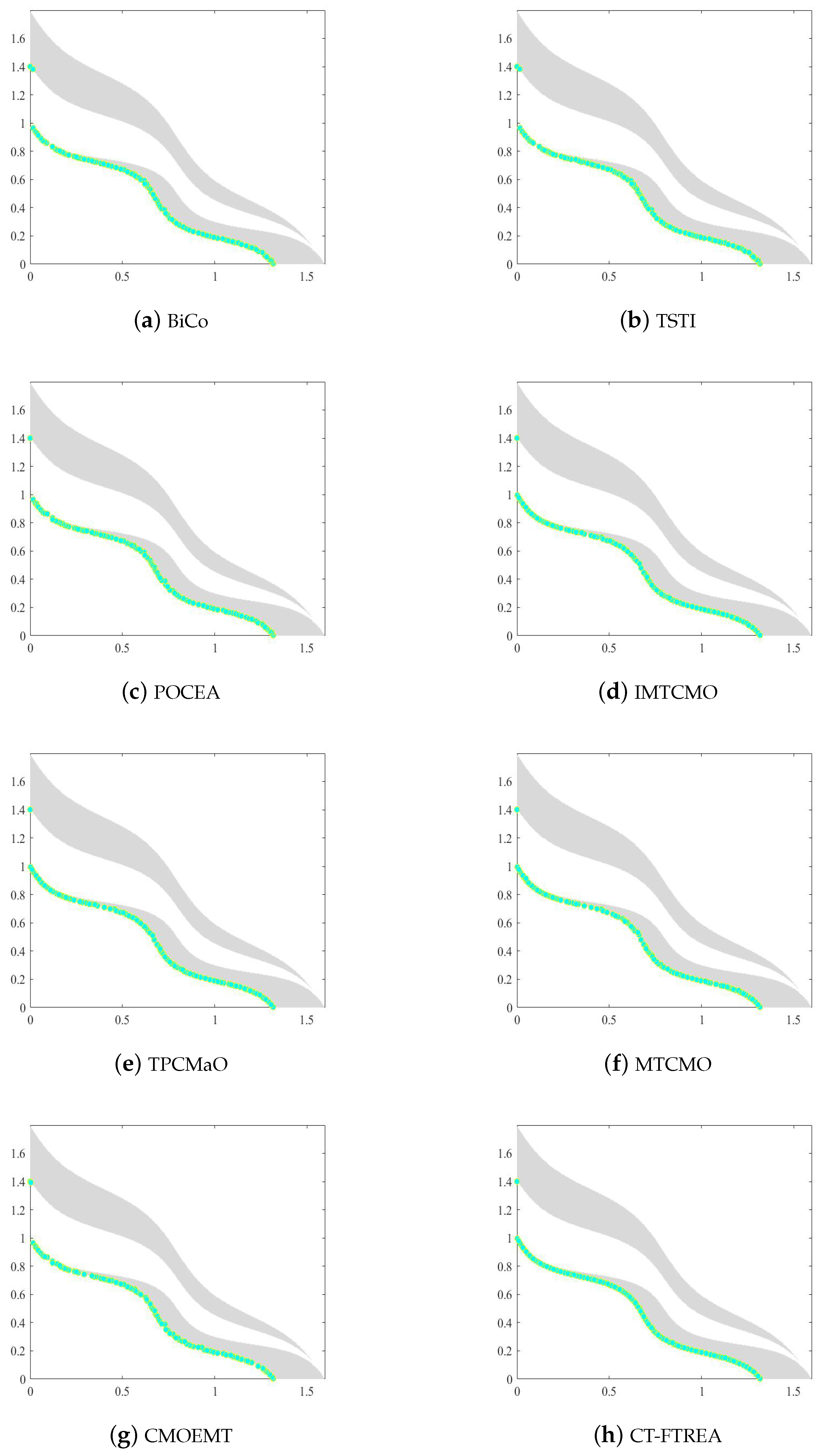 - CT-FTREA2: The adaptive constraint boundary tightening strategy is removed and replaced with a fixed constraint boundary. This experiment examines the contribution of the strategy in guiding the population into the feasible region, increasing the proportion of feasible solutions, and improving the approximation of the CPF.