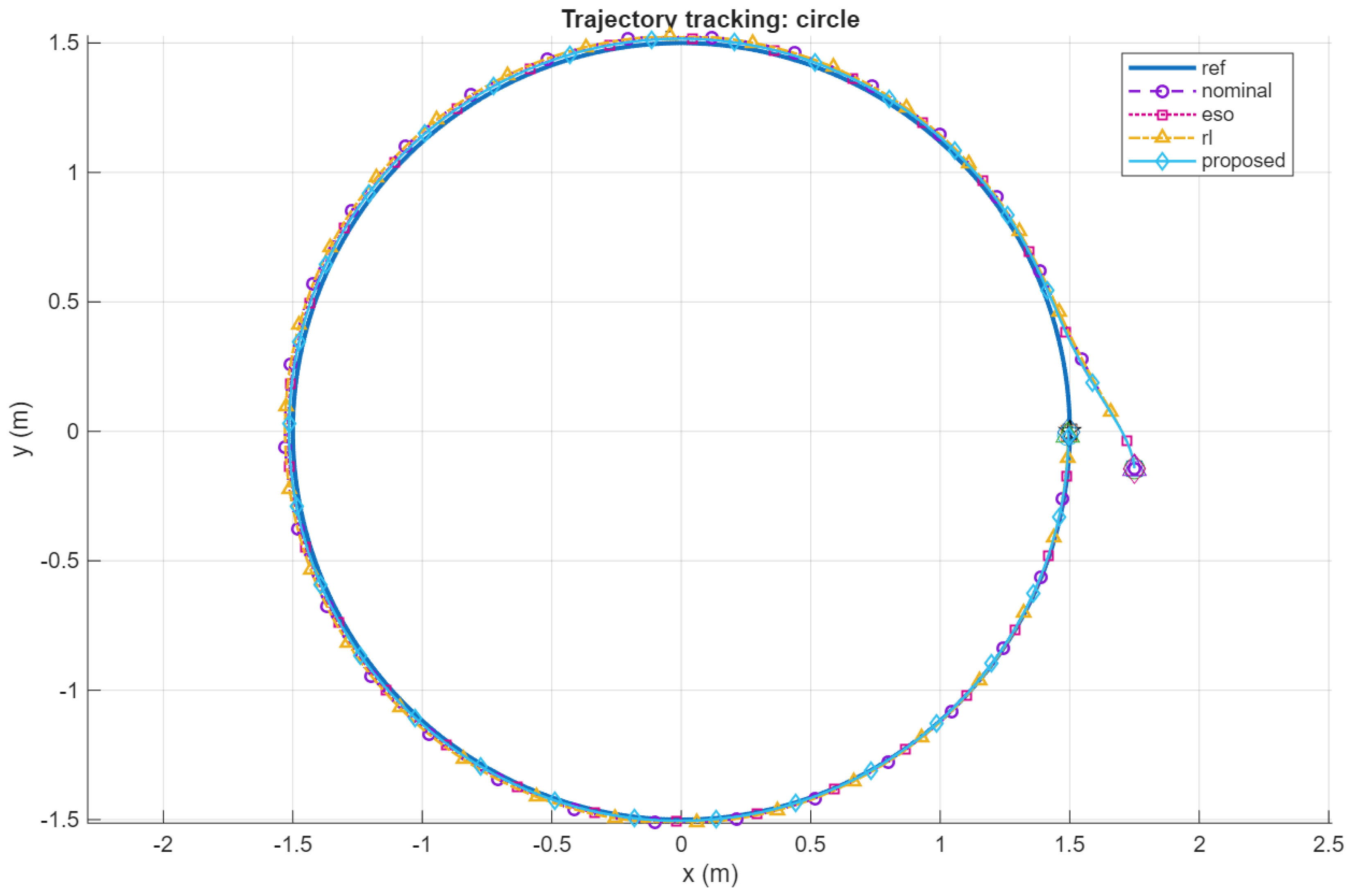 All compared controllers share the same plant, the same reference trajectory, and the same actuator constraints. Thus, differences in performance are attributable to the control law rather than feasibility handling. We compare an ablation study and four methods: (i) nominal feedback (no ESO/RL),